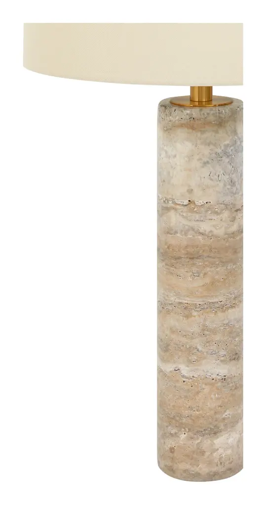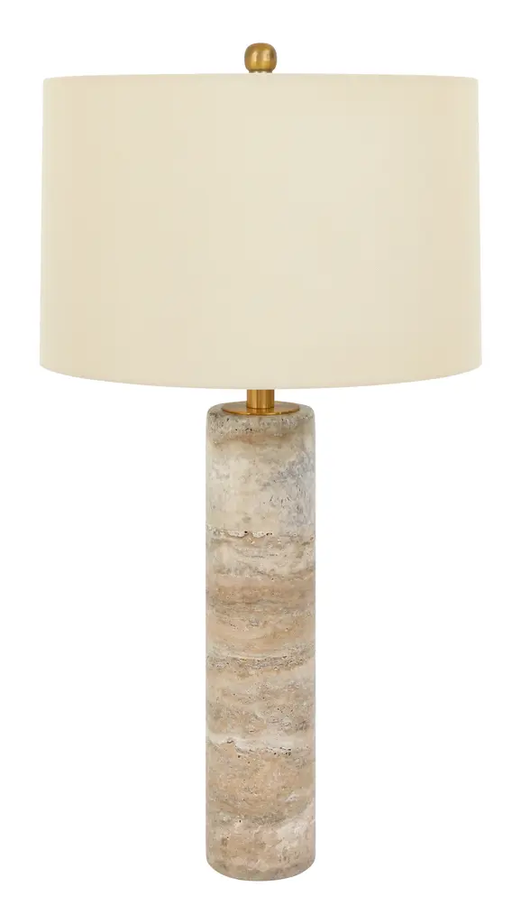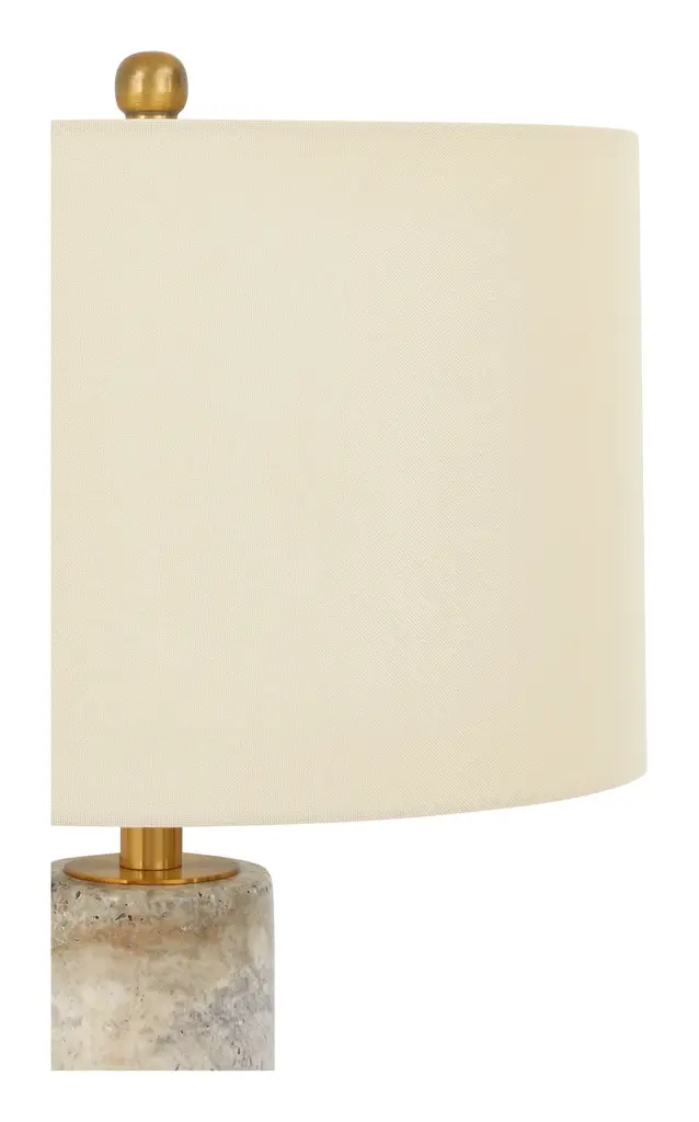 Cast a glow on your space with our chic yet timeless Cicero Lamp. This natural beauty features a simple, cylindrical base crafted from porous, cream-colored marble, with organic stripes and swirls of white, grey and sandy brown striations that make each one unique. We’ve finished it with a neutral linen drum shade and matte brass details for a subtle touch of shine. Perfection on the end table in both a modern or classic living room, Cicero’s stately, column-like presence also makes it great as a pair on a spacious entryway console or a set of nightstands. •grey marble •neutral linen drum shade •antiqued brass details •3-way rotary switch•clear cord•requires 100W max/type A bulb•each is unique; variations in color and organic features should be expected Dimensions•15" diameter x 27.5"H•base: 4" diameter x 16"H•shade: 15" diameter x 10"H