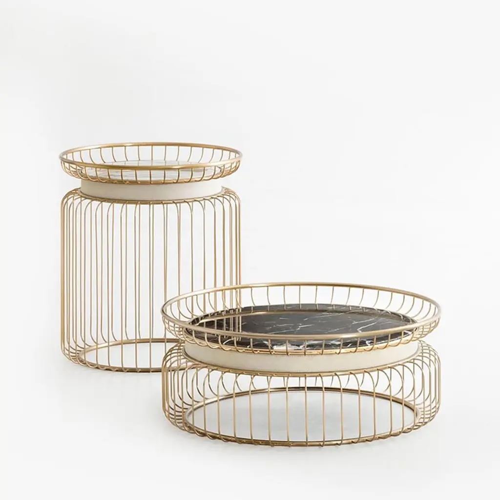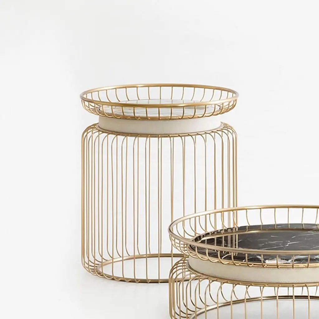 Coffee table Cigala with structure in stainlesssteel in gold finish with a black round emperadormarble top. With white genuine leather trim belowto the top.