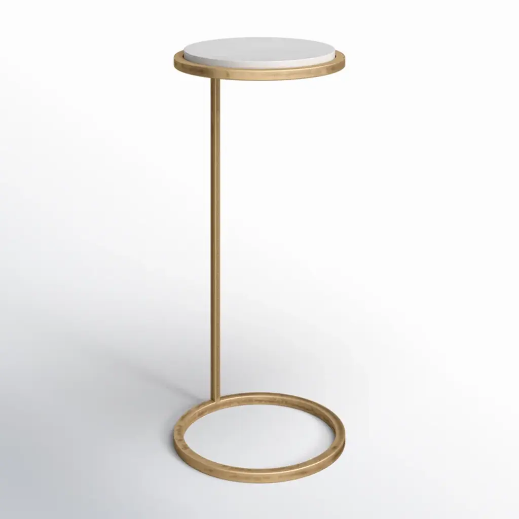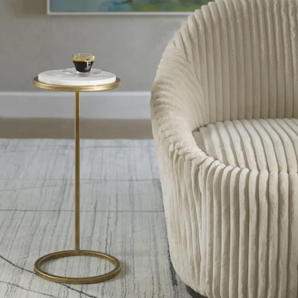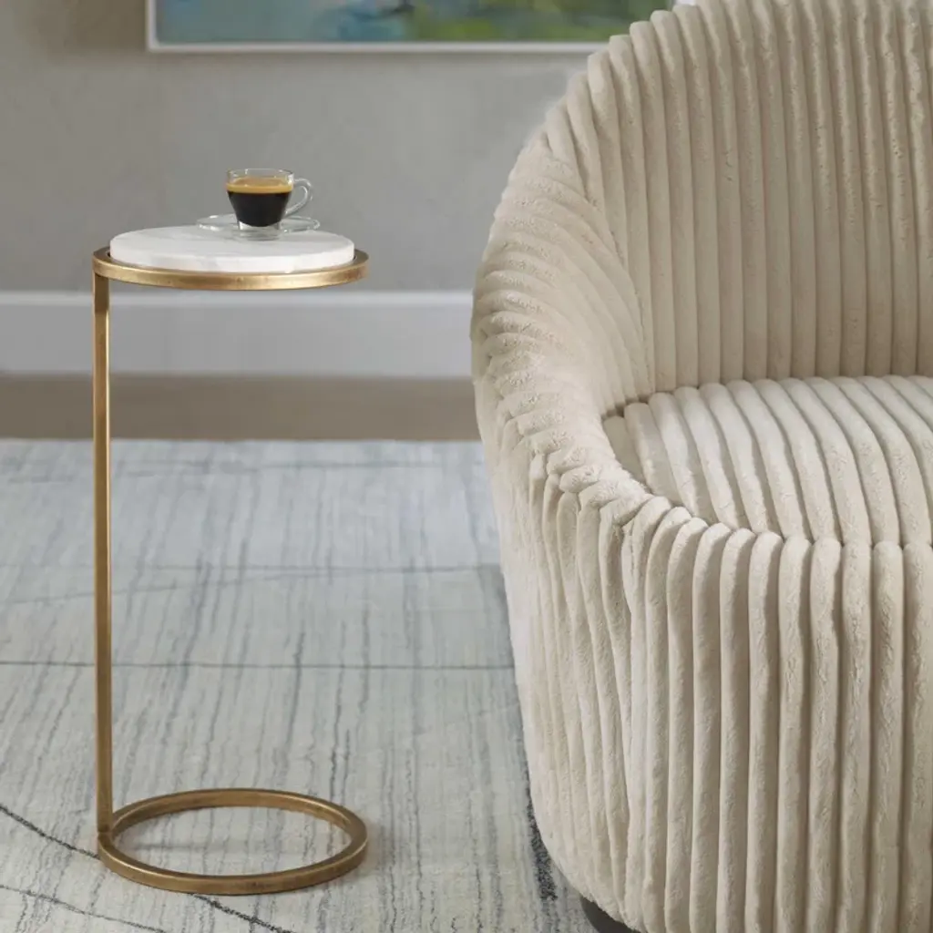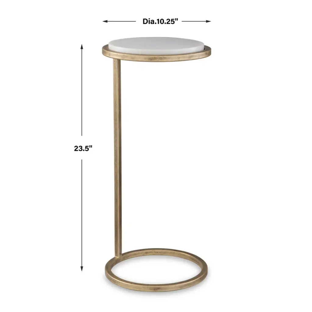 This contemporary accent table features a white marble top paired with an aged gold iron frame. This beautiful combination will be an asset in almost any room.