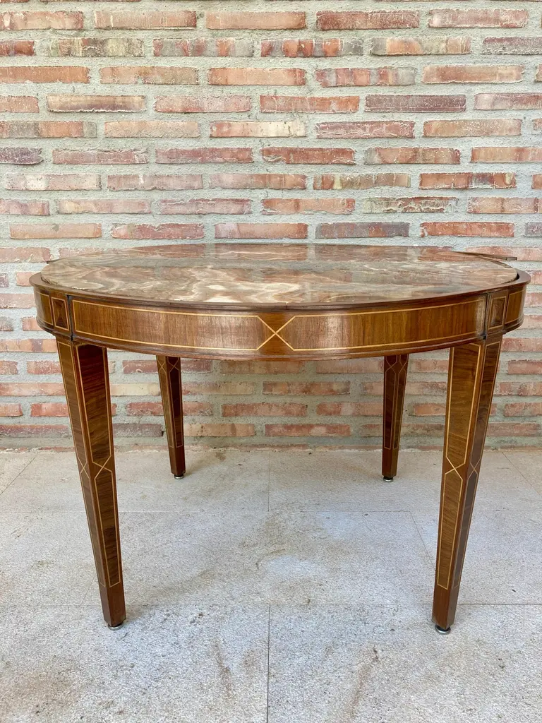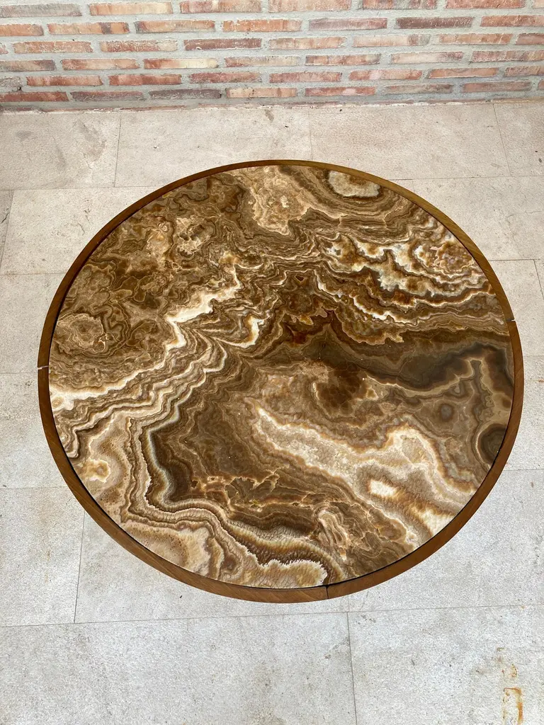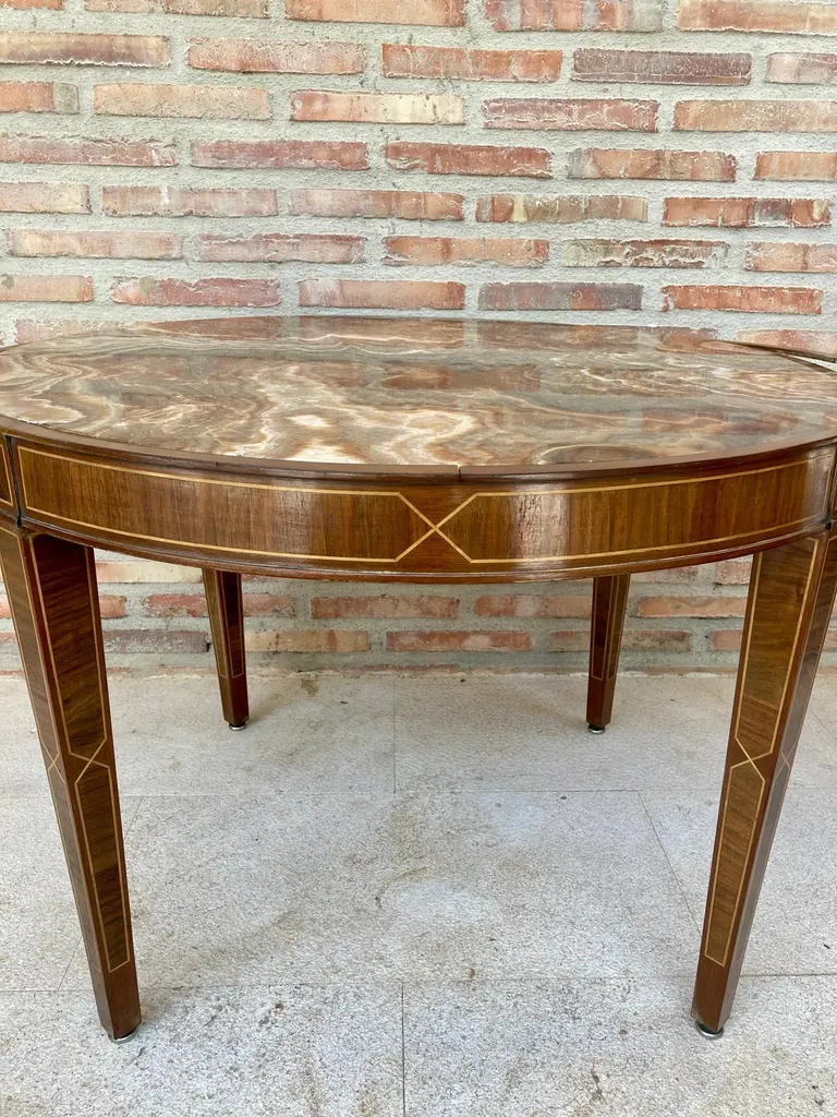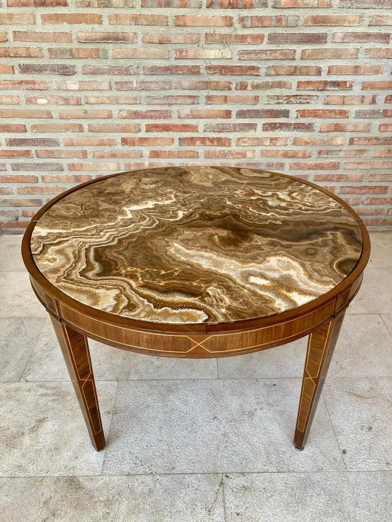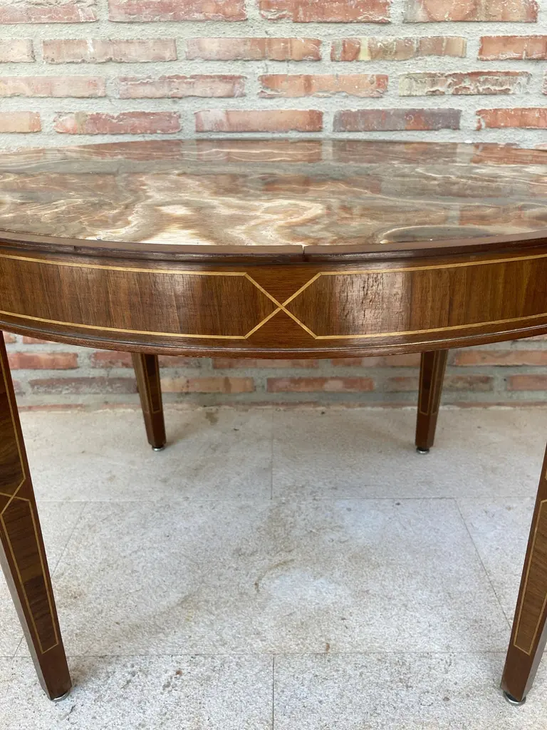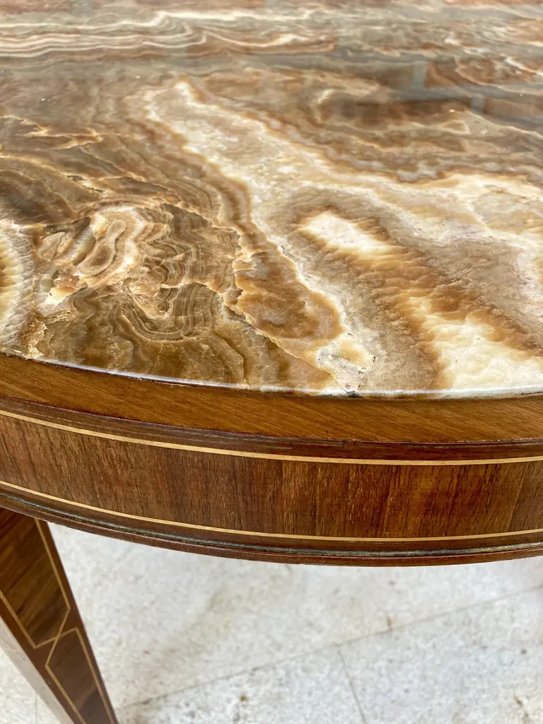 Circular side table. In wood with lemongrass marquetry fillets and agate lid.