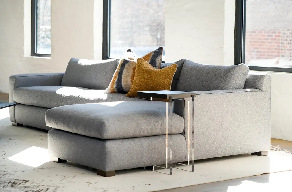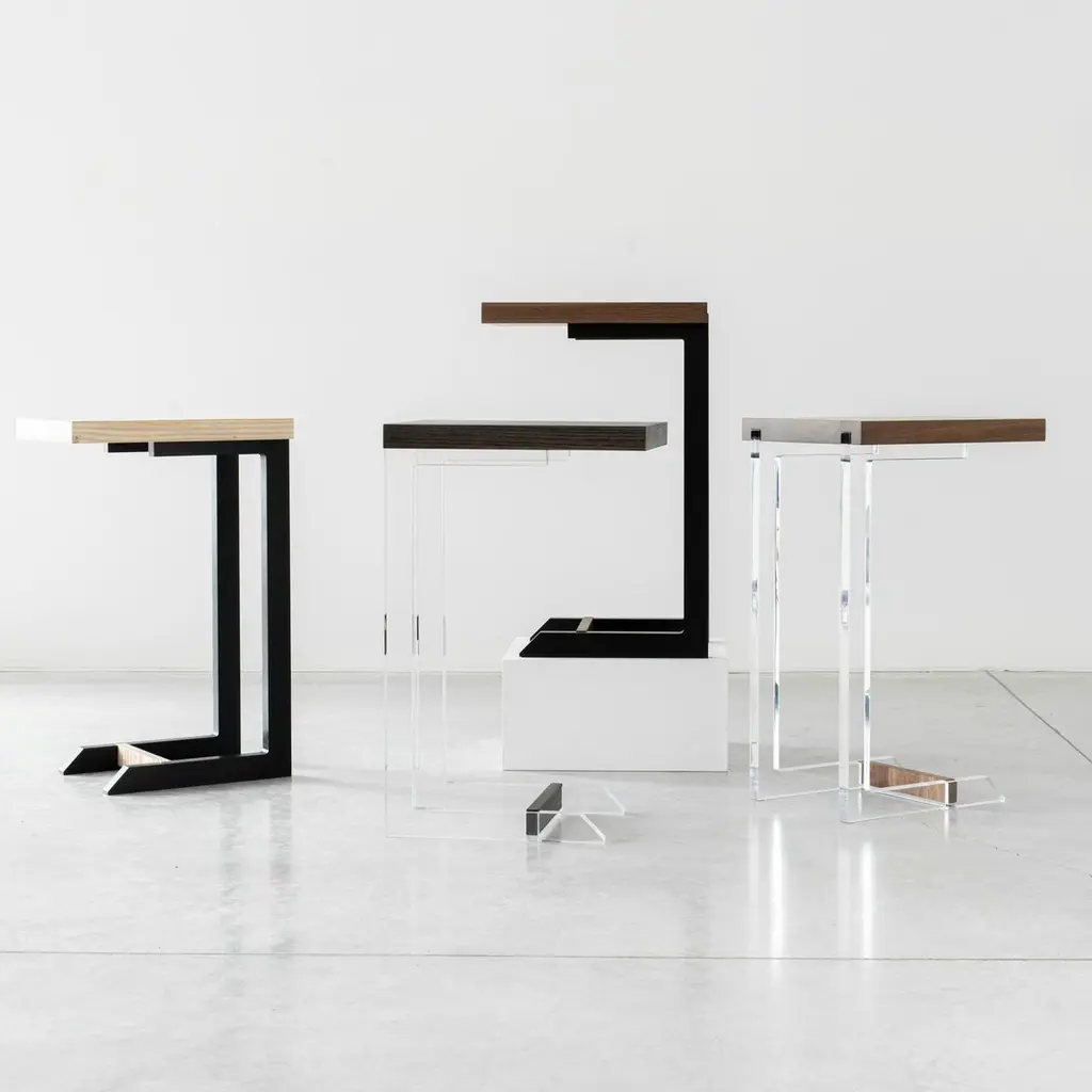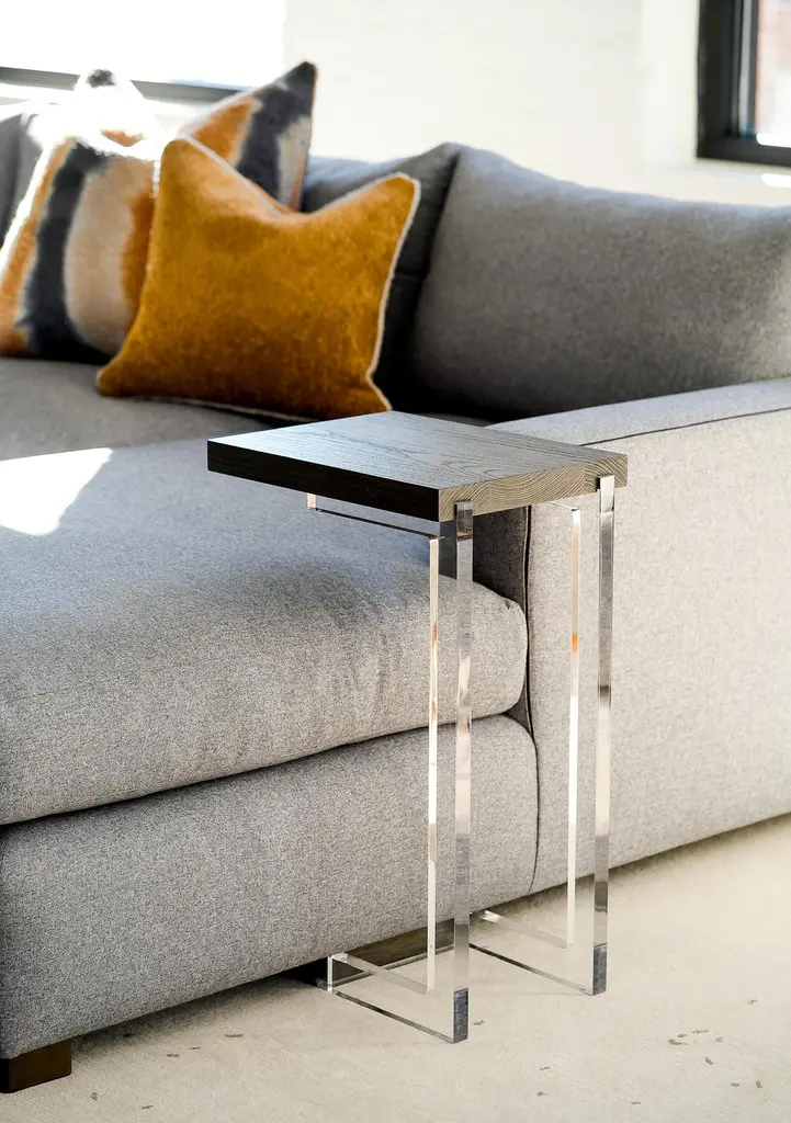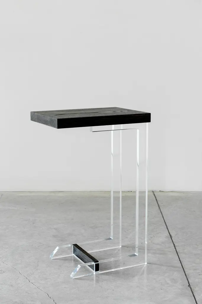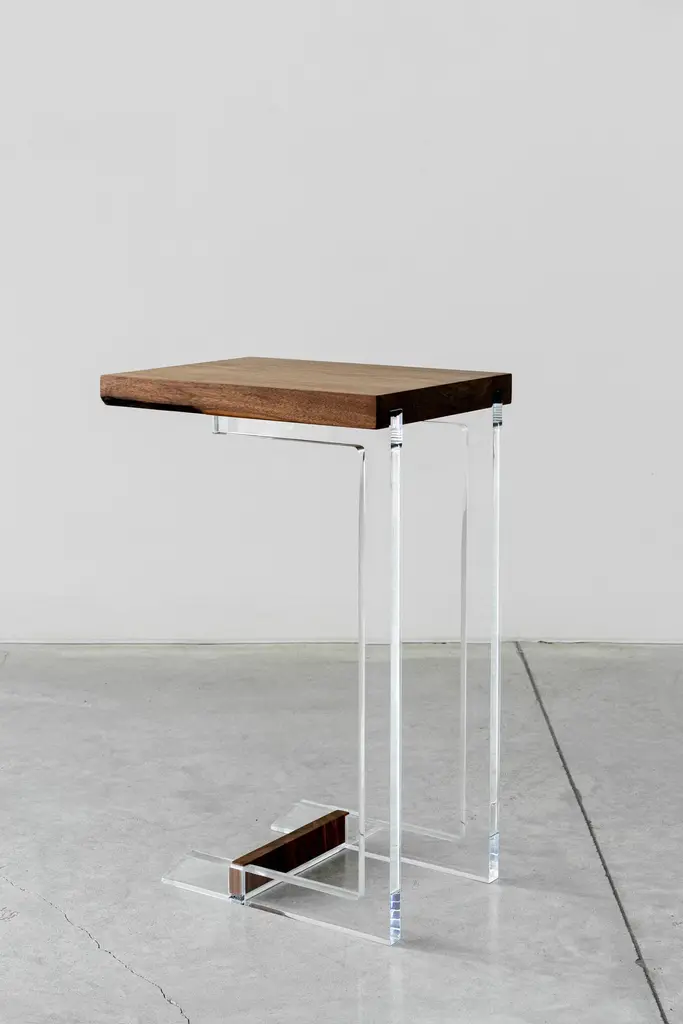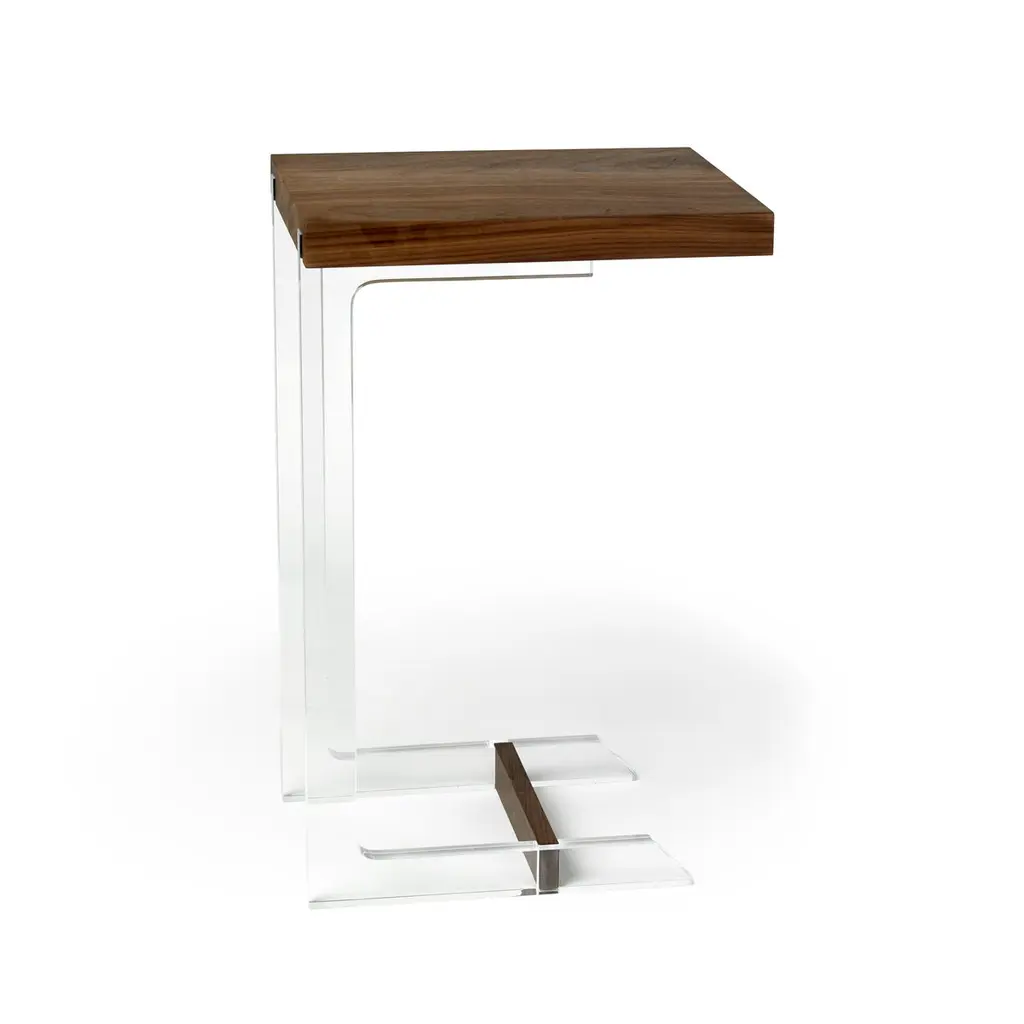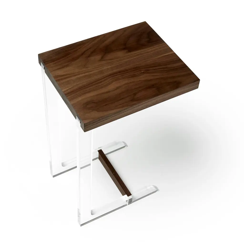 An end table that is always there when you need her, pulled up to a sofa for a cocktail or cup of tea, much like a best friend. The Clair End table was designed in a sleek silhouette of clear acrylic, adding a touch of brilliance, shown in a black walnut tabletop inset into the acrylic base. This contemporary side table is light for ease of movement to pull up to your favourite seat.Meticulously handcrafted side table with sustainable materials. Contemporary wood side table contrasting with the polished acrylic legs.Measures: 16” L x 11.75” W x 25" H.Height under the tabletop to clear chair/sofa is 23.75”.Walnut with oil and wax finish. Also available in Whitened Ash, Torched Oak, White Oak, Western Maple, and Douglas Fir.Clear acrylic legs with eased edges.