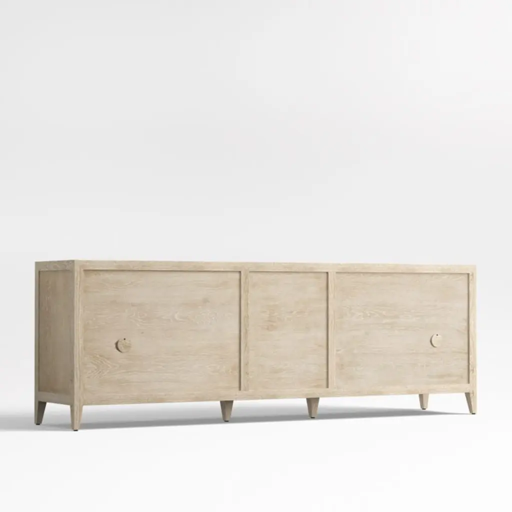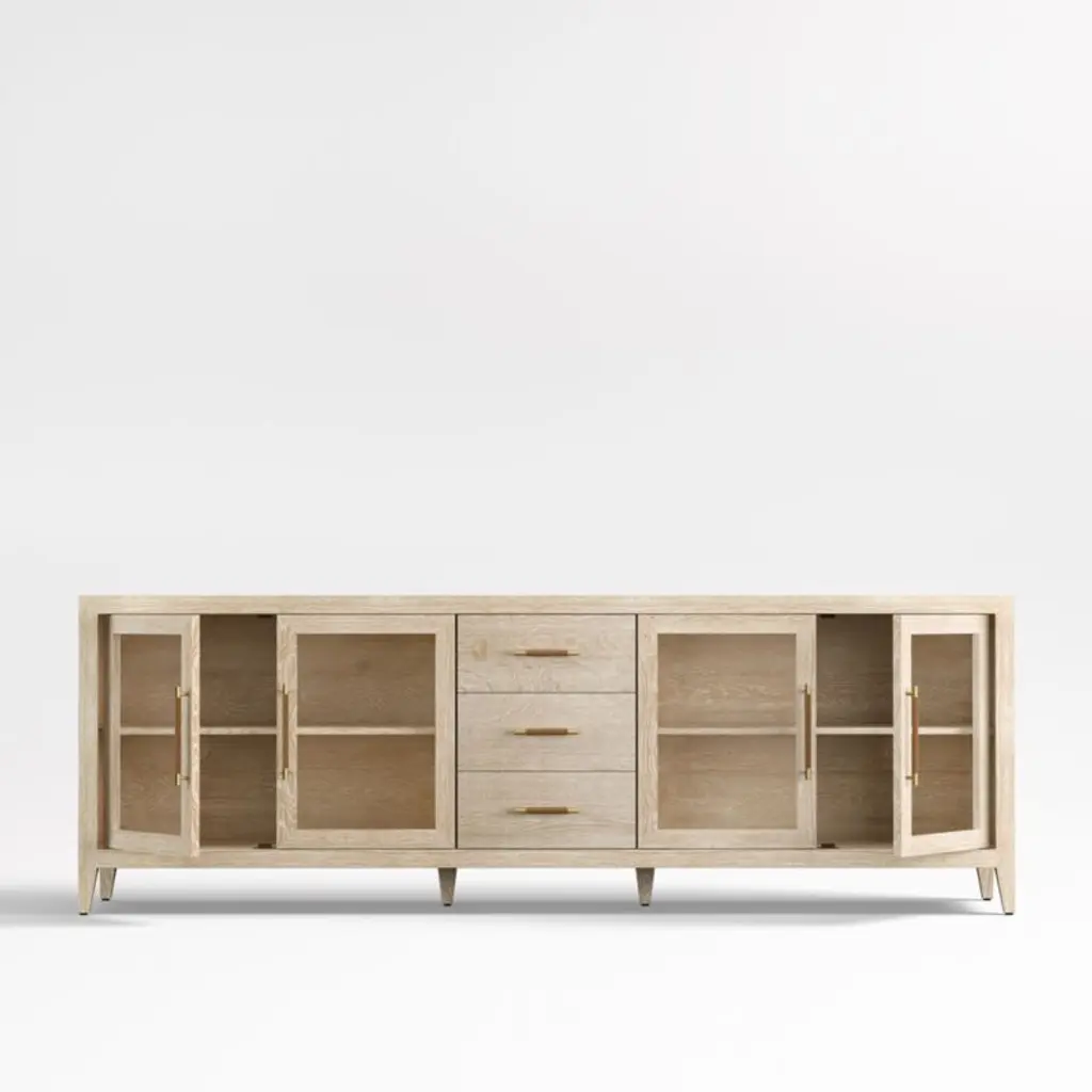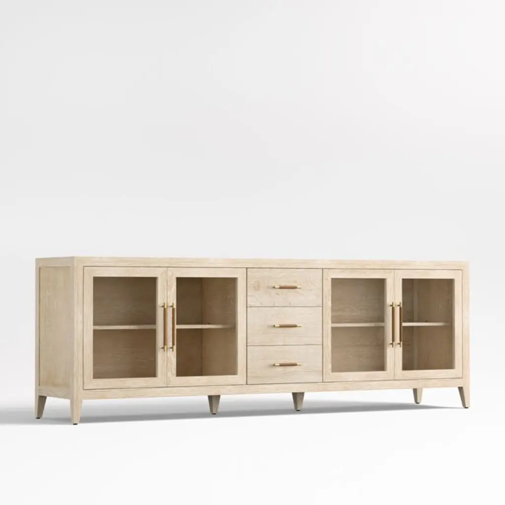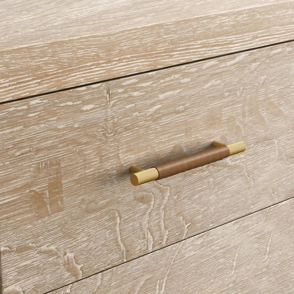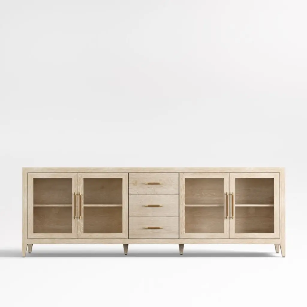 We've translated the refined elegance of our popular Clairemont accent tables into a storage collection made of beautifully grained oak. Standing on tapered legs, the clean-lined media console features neat mitered corners and recessed panels on the top and sides. Glass-paned cabinets, each with an adjustable shelf, flank a stack of three drawers. Brass-finished pull handles with distressed leather wrapping provide access along with a mixed-material grace note. A light driftwood finish with ivory cerusing highlights the wood's beautiful cathedral graining.