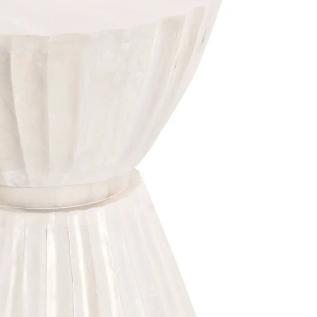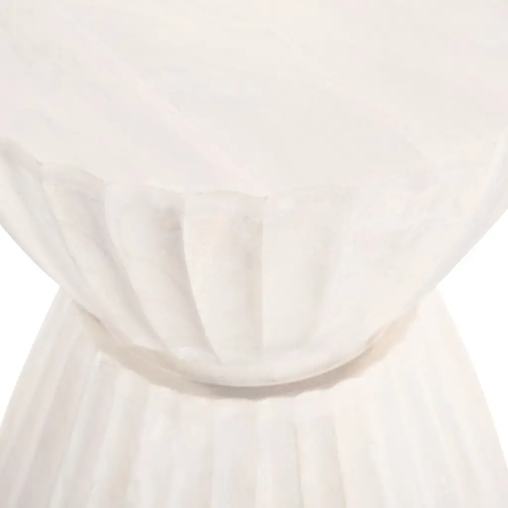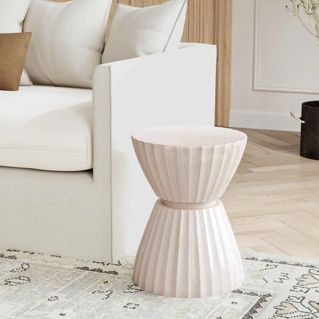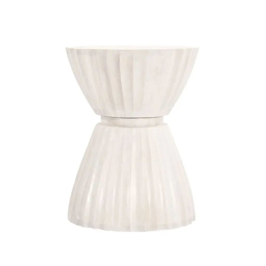 This sculptural accent table featuring a cinched hourglass shape is the embodiment of modern luxury at an affordable price. Crafted from FSC Certified mango wood and finished in a beautiful white washed hue; the distinctive scalloped base design is inspired by organic forms found in nature, including the ridged stem of a mushroom or elegant ripples of a seashell. Each piece is a testament to the artistry involved, with variations in wood grain and color enhancing the one-of-a-kind beauty of every side table. Complete the look by pairing it with the matching coffee table.