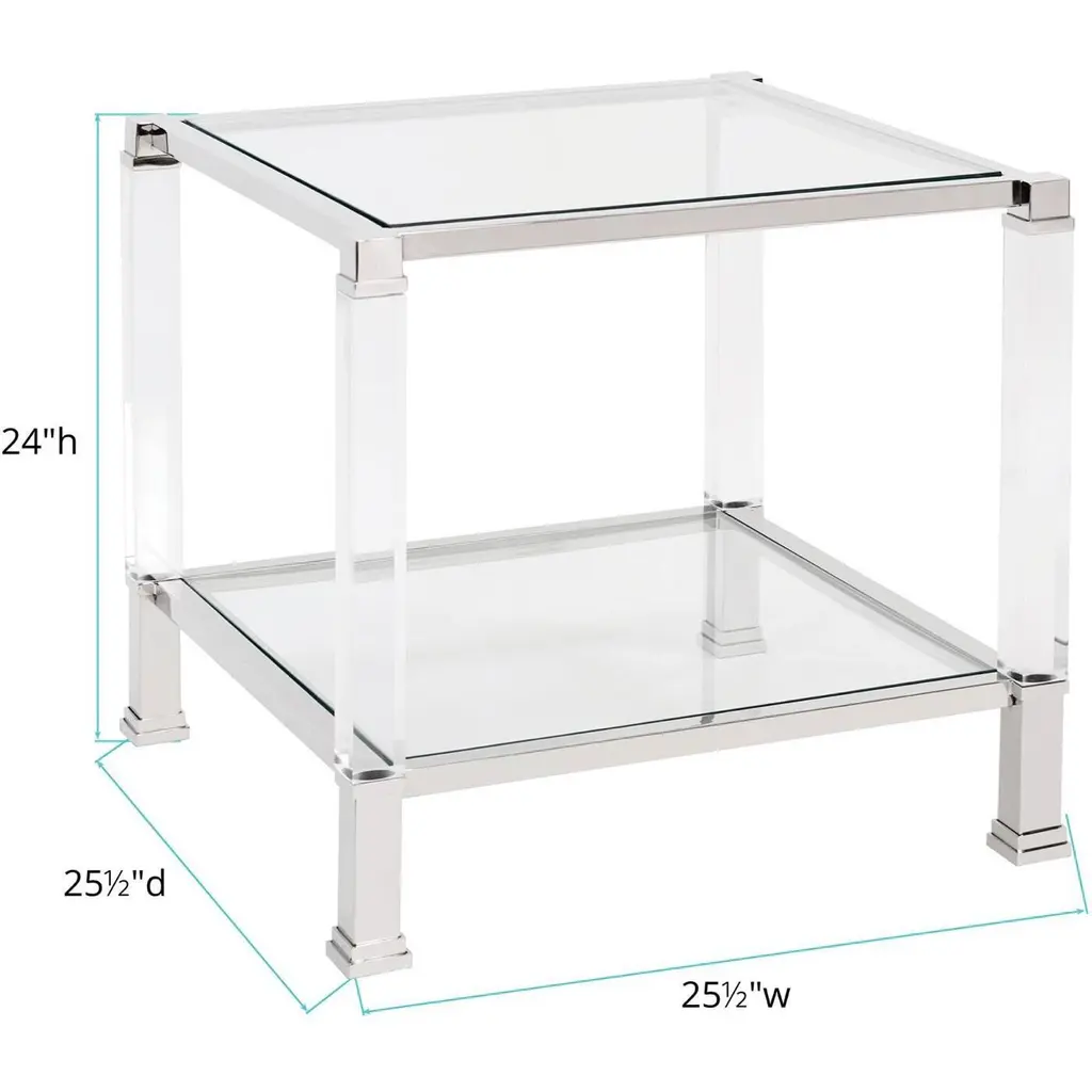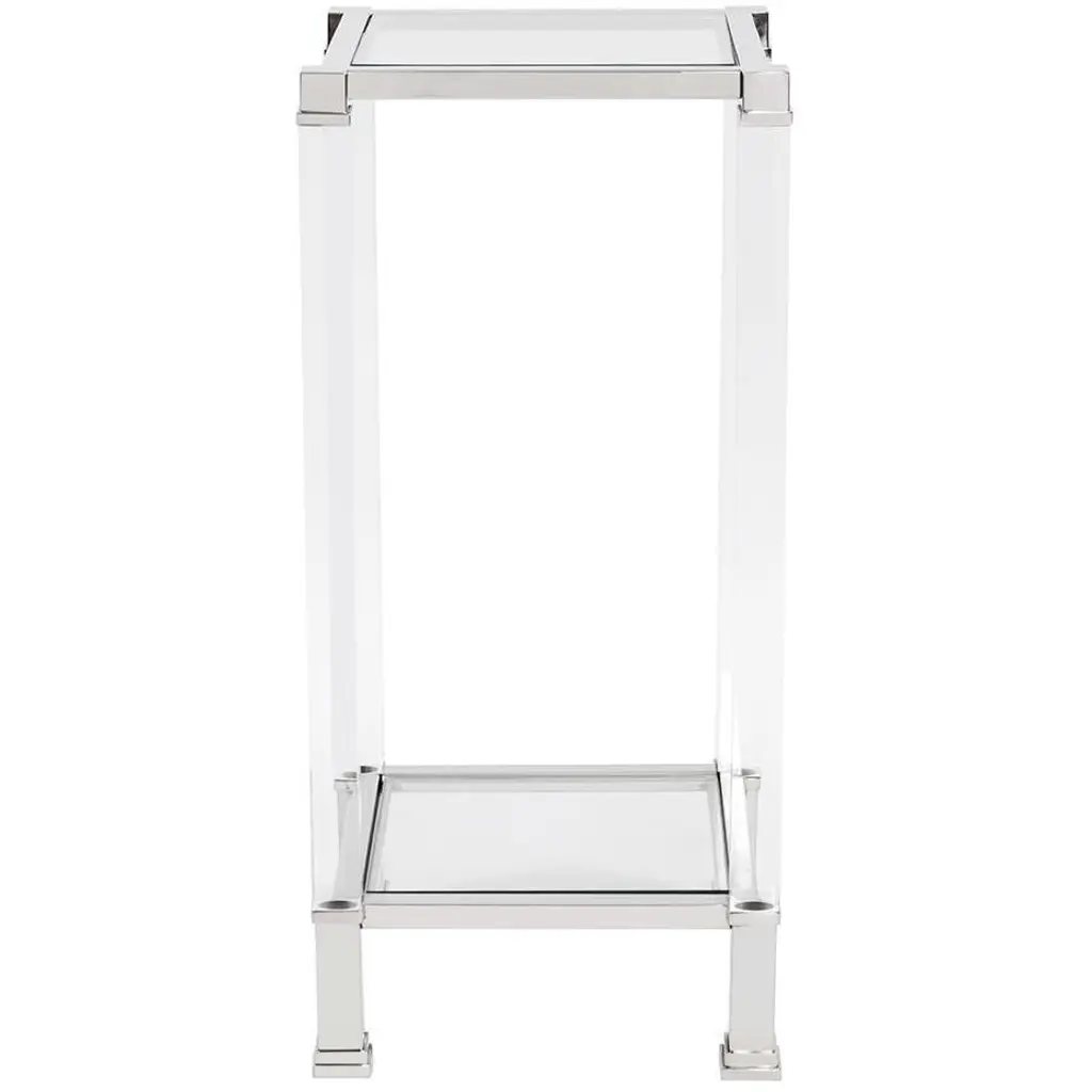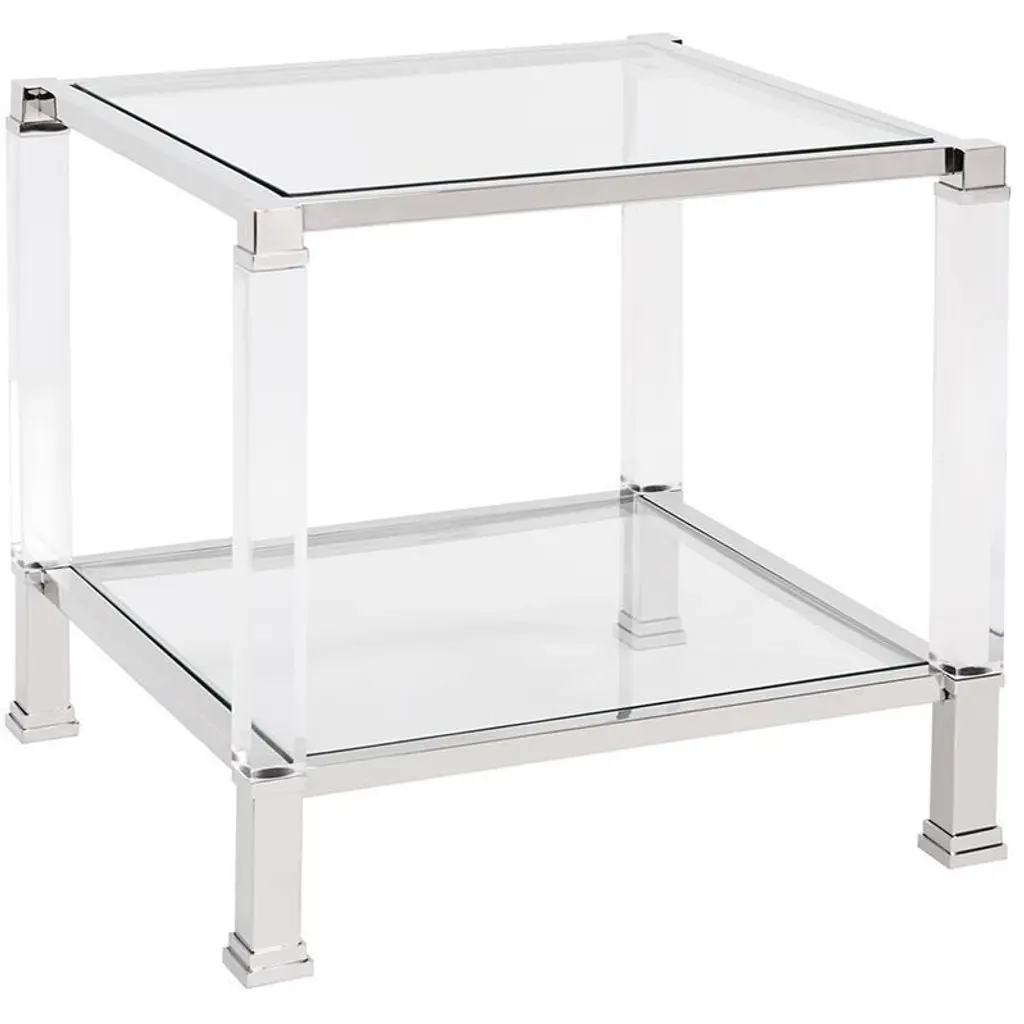 The distinct design of our Clare Side Table is clear! It features mixed materials combining them to create this stunning collection of tables. Thick, 1.3/4 acrylic legs provide the sturdy base for a polished stainless steel frame which houses thick tempered glass surfaces. The collection also includes a console, pedestal and coffee table, sold separately. Pair them together to complete the look. Coordinating Clare Mirrors are also available.