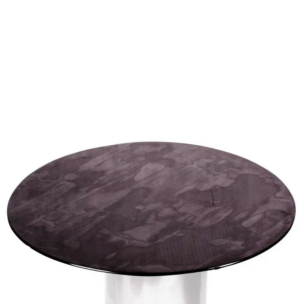 This striking side table will be a distinctive addition to any contemporary or minimalist decor, infusing it with unparalleled sophistication. Resting on a luminous steel structure boasting a classic cylindrical shape, the round top is fashioned of a special type of carbon fiber combined with parts of aerospace material to create stunning black hues over the dark-grey backdrop.