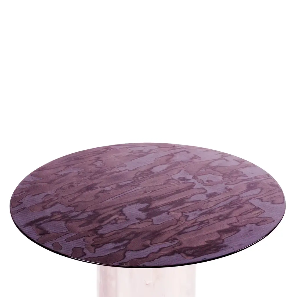Boasting a singular round top crafted of a blend of carbon and glass fibers with aerospace materials, this side table is distinguished by unique and mesmerizing tones. Mounted on a cylindrical steel base, this piece will make a statement of its own or paired with other pieces from the same series for a refined and dynamic accent.