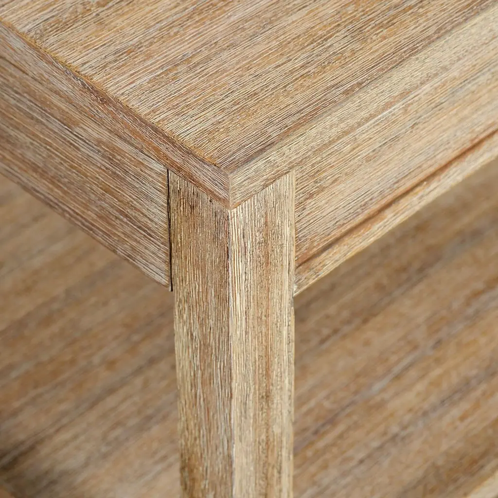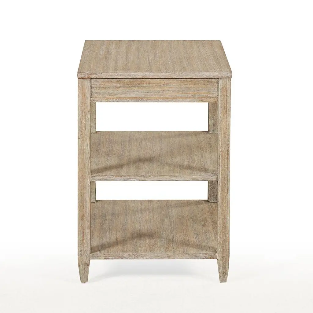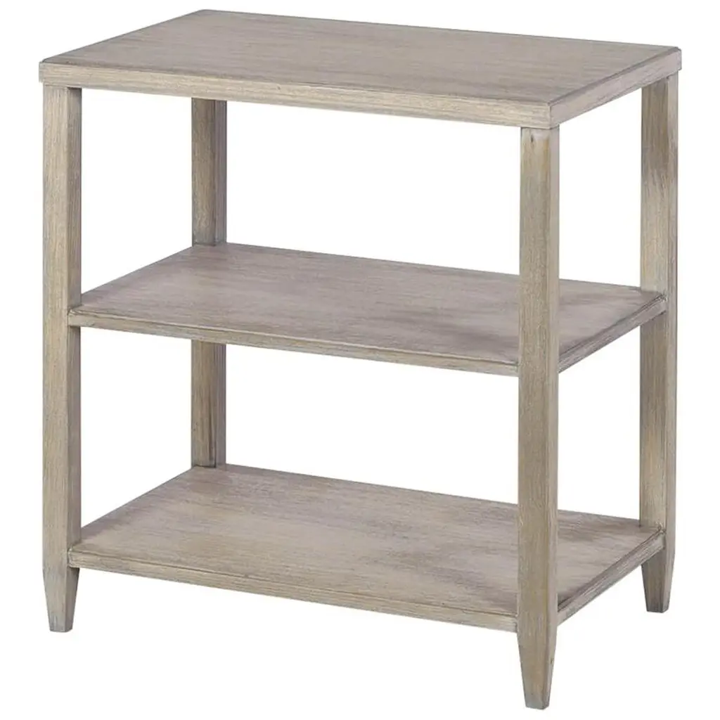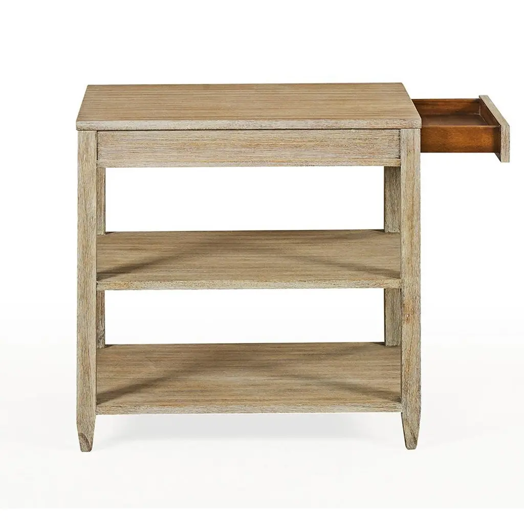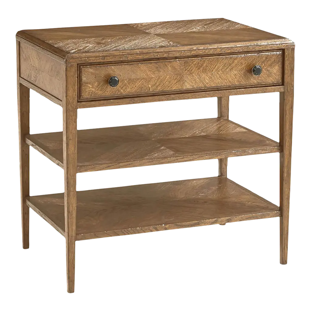This side table boasts one drawer, two shelves, and elegant brass hardware, seamlessly combining beauty and functionality.The weathered finish with natural highlights and distressing adds a rustic charm, making it a perfect accent piece for any room. Its tapered feet enhance the timeless design, providing a stable and stylish foundation.Ideal for displaying decorative items, storing essentials, or placing beside your favorite armchair, this side table enhances your interior with its sophisticated appeal.Dimensions: 26" W x 18" D x 26" H