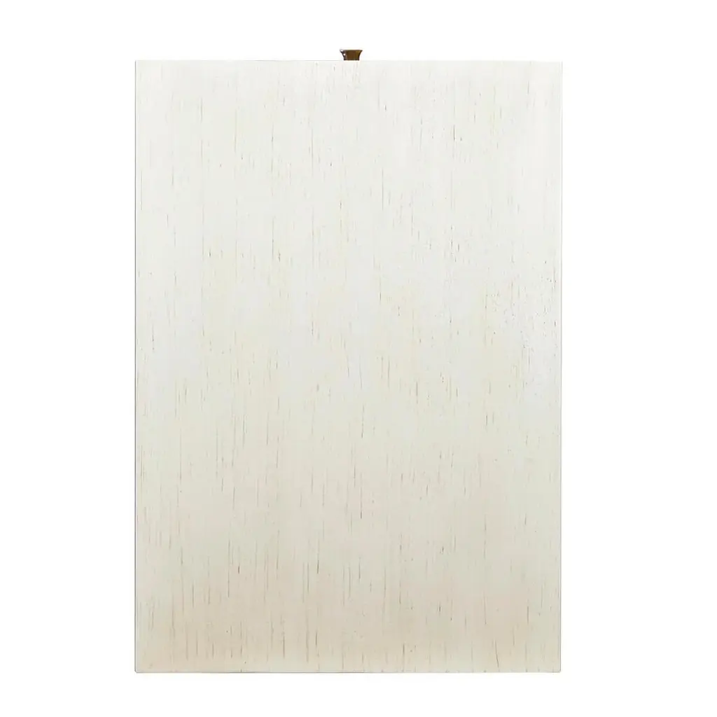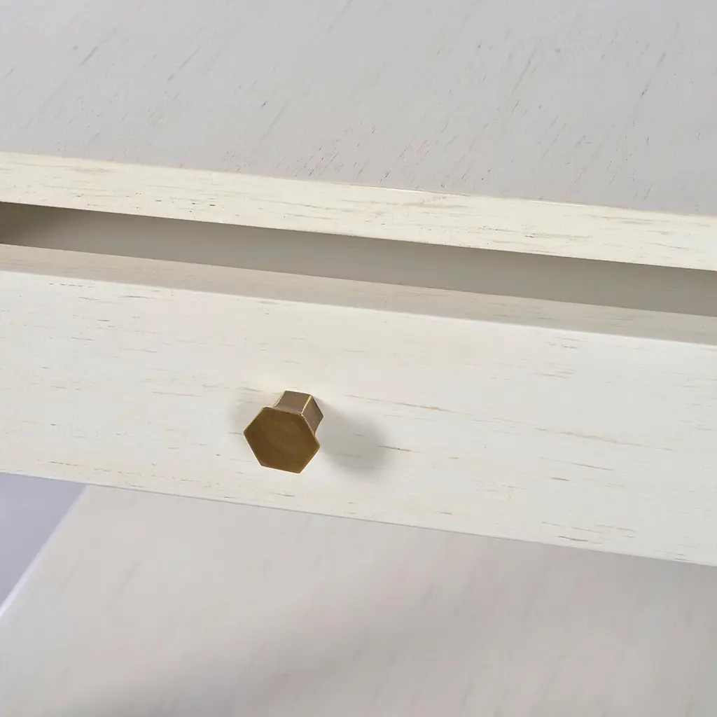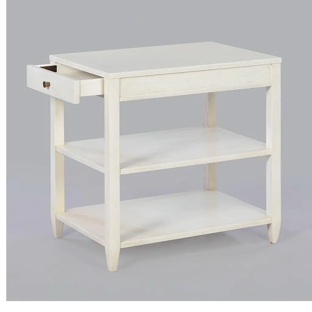 Classic narrow rectangle side table with a drawer, two shelves, brass hardware, and tapered teen, has a “drift” white painted finish with a subtle grey distressing and hand-rubbed finish.Dimensions: 26" W x 18" D x 26" H.