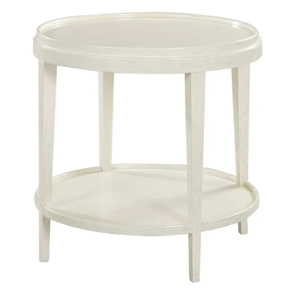 A round end table with our unusual light rabbit finish on Celtids veneer and solids. The two-tier side table with a wooden galleried dish top, with square tapered legs and a round shelf stretcher base.Dimensions: 27" W x 27" D x 27" H