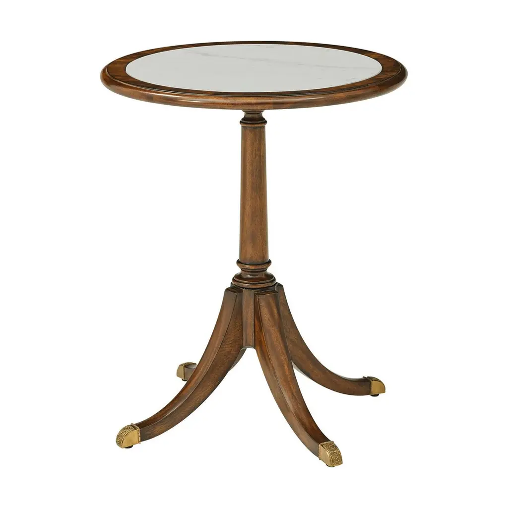 Bring refined Regency-era style into the modern home with its elegant proportions and luxurious craftsmanship. The round top features an inset marble top with a wooden border.A turned pedestal base supports the top with graceful symmetry, while four saber legs curve outward and rest on ornate brass caps, grounding the piece in neoclassical tradition. Finished in a warm medium brown tone, this table makes a sophisticated statement as a side or entryway accent.Dimensions: 20" W x 20" D x 24" H