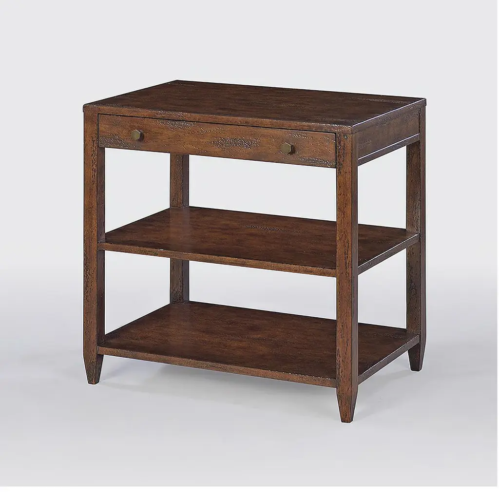 Classic wide rectangle side table with a drawer, two shelves, brass hardware, and tapered feet, has a “country” mahogany wood tone with natural highlights.Dimensions: 26" W x 18" D x 26" H.