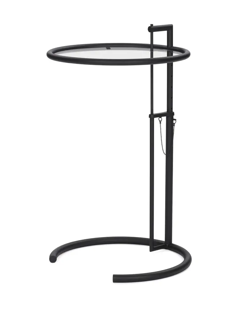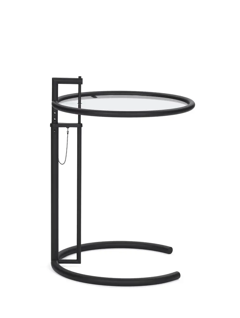 This is perhaps the classic among the classics. Its ingeniously proportioned, distinctive form has made this height-adjustable table one of the most popular design icons of the 20th century. It is named after the summer house E 1027 “Maison en bord de mer” that Eileen Gray built for herself and for her collaborator, Jean Badovici. The secret code-name likewise comes from her: E is for Eileen, 10 for Jean (J is the 10th letter of the alphabet), 2 for B(adovici) and 7 for G(ray).Side table. Height-adjustable base, powder-coated tubular steel in black. Tabletop clear crystal glass. Dimensions: W 52 cm, H 102 cm.
