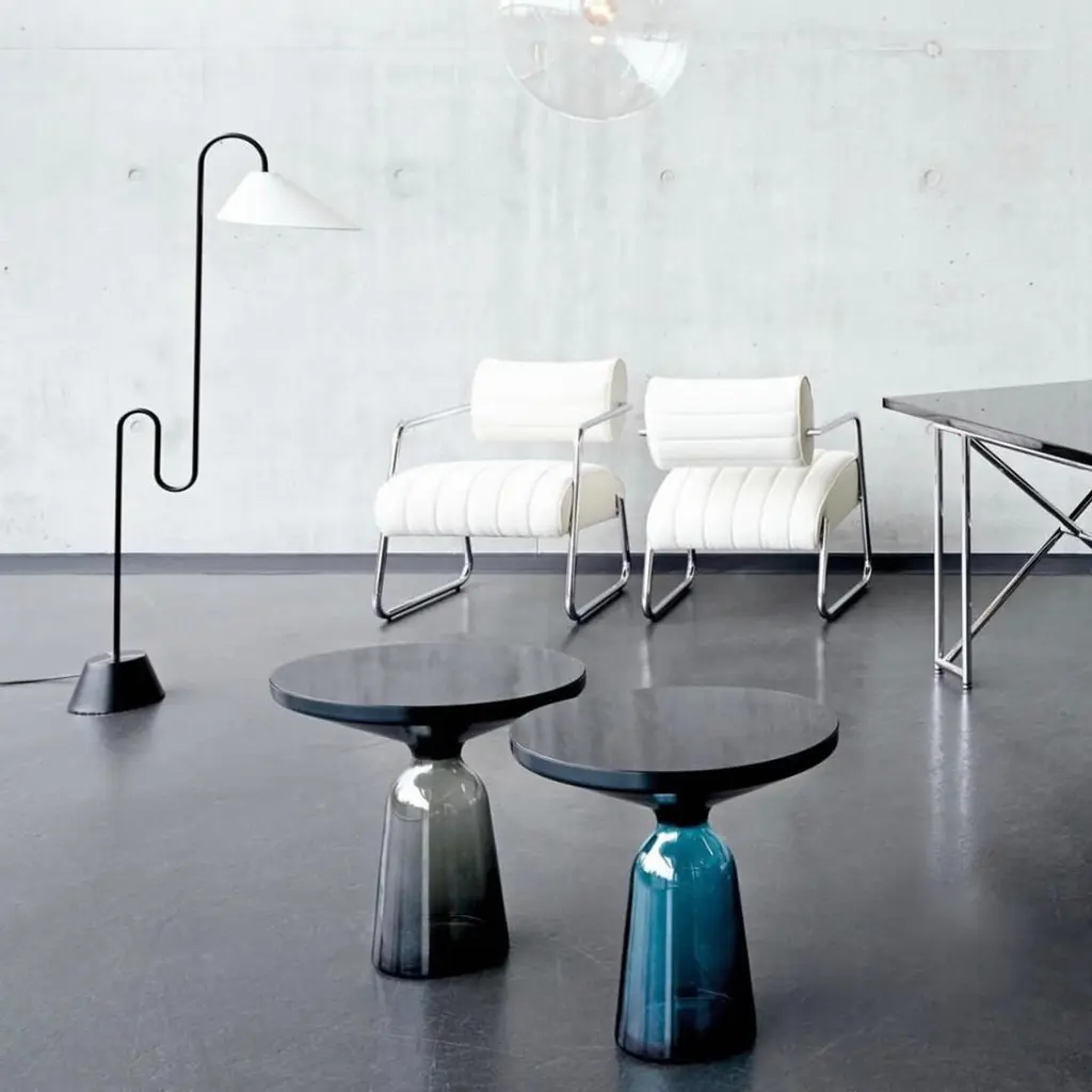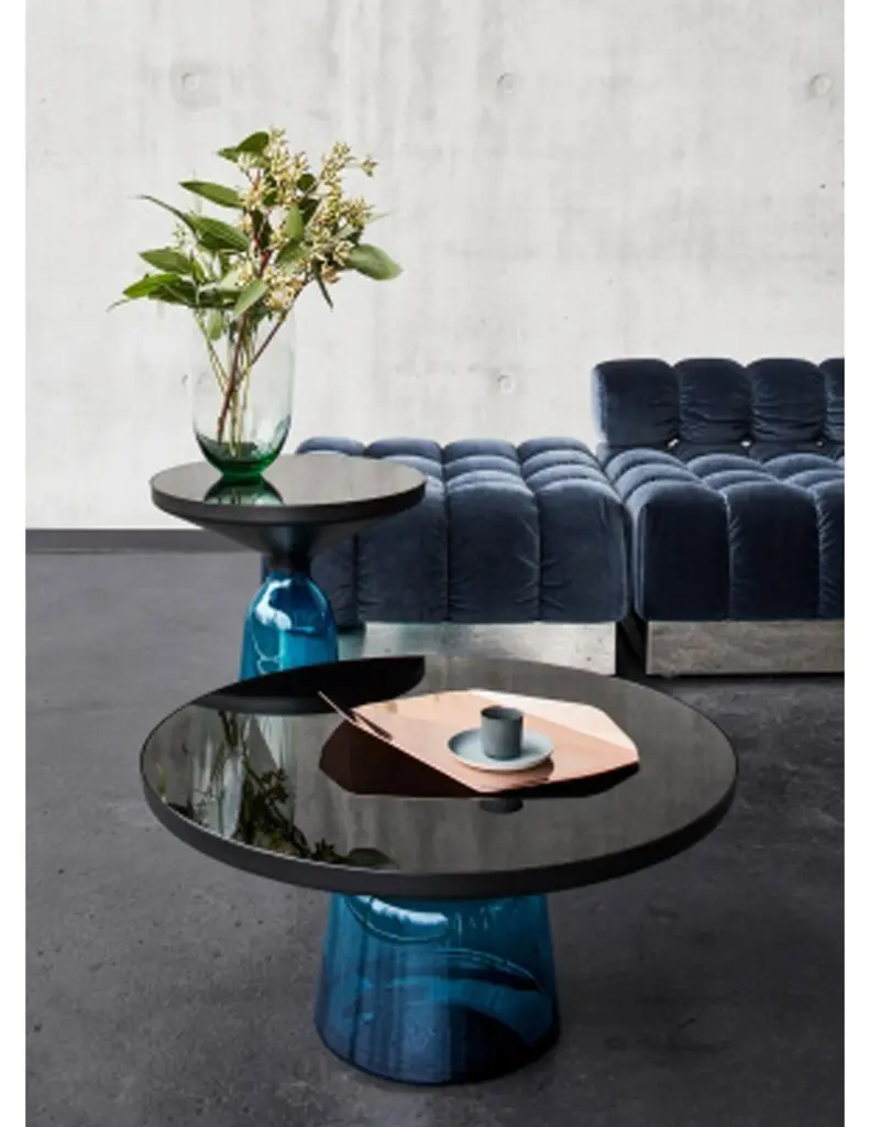 The bell table by Sebastian Herkner turns our perceptual habits on their head, using the lightweight, fragile material of glass as base for a metal top that seems to float above it. Hand blown in the traditional manner using a wooden mold, the transparent tinted glass base asserts a sculptural presence in space, contrasting intriguingly with the solid brass frame on top while also forming with it a harmonious unit recalling the elegant curving silhouette of a bell. With its appealing reflective surfaces and contrasting materials, the side table adds a distinctive touch to domestic interiors. It celebrates the beauty of the materials with their colors and surfaces, along with the virtues of hand-craftsmanship. The Bell Table by Sebastian Herkner is a masterwork of traditional hand craftsmanship. Each table is handmade, meaning that small bubbles or bumps in the glass are a characteristic feature.Side table. Hand blown glass base. Metal top frame in solid black burnished steel, with clear varnish. Round crystal glass tabletop, black lacquered, polished and impregnated. Handcrafted. Dimensions: Ø 50 cm, H 53 cm.