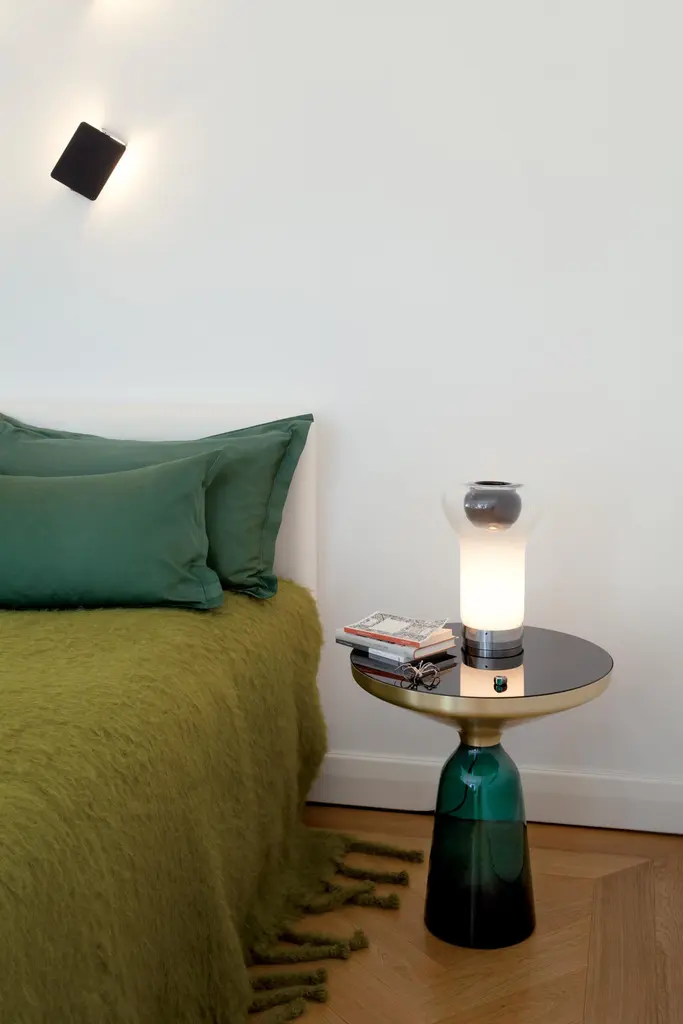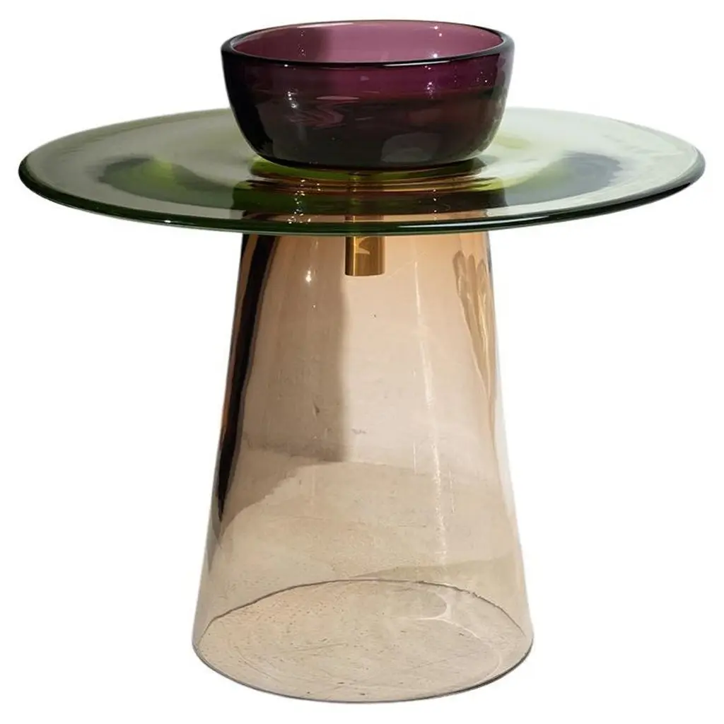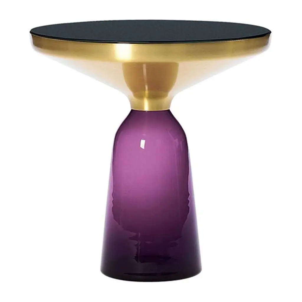 The “Bell Table” by Sebastian Herkner turns our perceptual habits on their head, using the lightweight, fragile material of glass as base for a metal top that seems to float above it. Hand blown in the traditional manner using a wooden mold, the transparent tinted glass base asserts a sculptural presence in space, contrasting intriguingly with the solid brass frame on top while also forming with it a harmonious unit recalling the elegant curving silhouette of a bell. With its appealing reflective surfaces and contrasting materials, the side table adds a distinctive touch to domestic interiors. It celebrates the beauty of the materials with their colors and surfaces, along with the virtues of hand-craftsmanship. The Bell Table by Sebastian Herkner is a masterwork of traditional hand craftsmanship. Each table is handmade, meaning that small bubbles or bumps in the glass are a characteristic feature.Side table. Hand blown glass base in quartz grey. Metal Top frame of solid copper, unlacquered, with round tabletop of crystal glass, black lacquered. Handcrafted. Dimensions: Ø 50 cm, H 53 cm.Special edition copper tables are numbered.