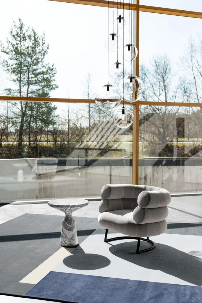 NEW introduced in MILAN 2023The bell table by Sebastian Herkner turns our perceptual habits on their head, using the lightweight, fragile material of glass as base for a metal top that seems to float above it. Hand blown in the traditional manner using a wooden mold, the transparent tinted glass base asserts a sculptural presence in space, contrasting intriguingly with the solid brass frame on top while also forming with it a harmonious unit recalling the elegant curving Silhouette of a bell. With its appealing reflective surfaces and contrasting materials, the side table adds a distinctive touch to domestic interiors. It celebrates the beauty of the materials with their colors and surfaces, along with the virtues of hand-craftsmanship. The bell table by Sebastian Herkner is a masterwork of traditional hand craftsmanship. Each table is handmade, meaning that small bubbles or bumps in the glass are a characteristic feature.Side table. Hand blown glass base. Metal top frame in solid brass. Round crystal glass tabletop, black lacquered, polished and impregnated. Handcrafted. Dimensions: Ø 50 cm, H 53 cm.`