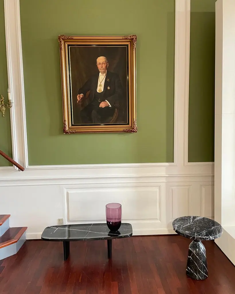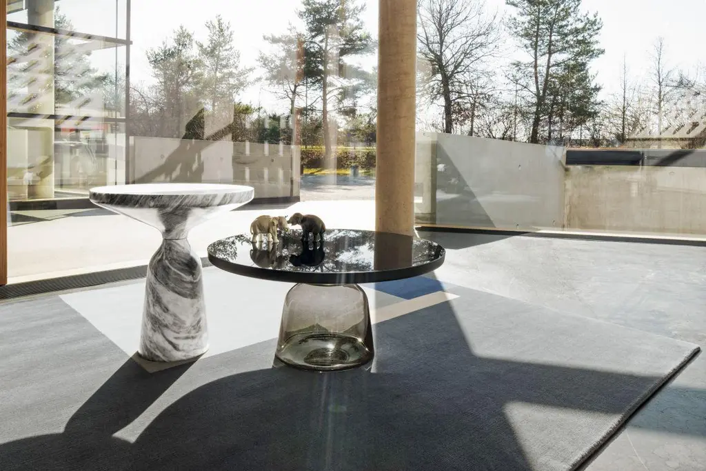 NEW introduced in MILAN 2023Nero Marquina, Emperador Dark, Bianco Carrara, Grigio Nuvolato or Green Guatemala. Green Guatemala extra charge.The bell table by Sebastian Herkner turns our perceptual habits on their head, using the lightweight, fragile material of glass as base for a metal top that seems to float above it. Hand blown in the traditional manner using a wooden mold, the transparent tinted glass base asserts a sculptural presence in space, contrasting intriguingly with the solid brass frame on top while also forming with it a harmonious unit recalling the elegant curving Silhouette of a bell. With its appealing reflective surfaces and contrasting materials, the side table adds a distinctive touch to domestic interiors. It celebrates the beauty of the materials with their colors and surfaces, along with the virtues of hand-craftsmanship. The bell table by Sebastian Herkner is a masterwork of traditional hand craftsmanship. Each table is handmade, meaning that small bubbles or bumps in the glass are a characteristic feature.Side table. Hand blown glass base. Metal top frame in solid brass. Round crystal glass tabletop, black lacquered, polished and impregnated. Handcrafted. Dimensions: Ø 50 cm, H 53 cm.`