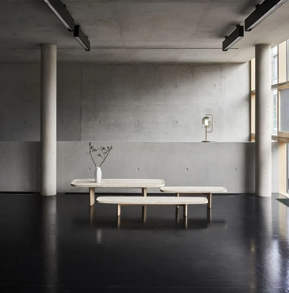 Each tabletop is a unique piece due to the natural grain of the travertine. Slight variations in colour, structure and surface are possible.The Matéria Low Board series is characterised by its unusual dimensions and aura of tranquillity. When taking a closer look, however, its nearly monochromatic appearance is revealed as an interplay of the porous travertine stone and smoothly finished wood. Matéria evokes an intuitive urge to touch the surfaces, to feel the natural textures. Originally a purely experimental design by German designer Christian Haas, it was expanded into a trio in cooperation with ClassiCon. Matéria is available in three different sizes and currently two surfaces. Individually or in combination, the handcrafted low boards rightfully take centre stage due to their materiality and reveal the sensual effect of reductionism.
