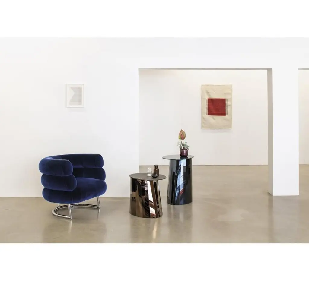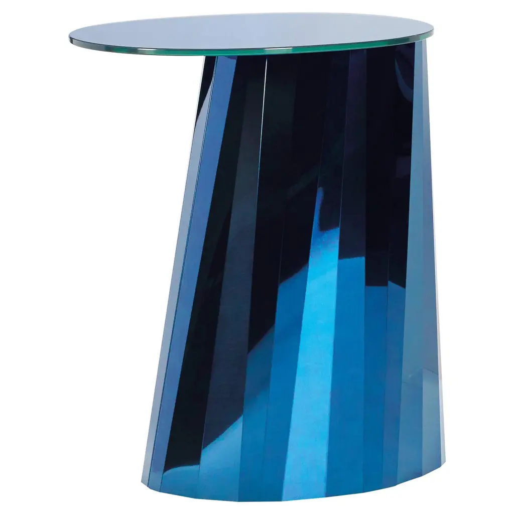 With the Pli side table series French designer Victoria Wilmotte brings objects of unusual crystalline elegance and astonishing geometry to living environments. The bends and folds that gave Pli its name almost make the stainless steel base look like an oversized finely polished precious stone. The four different color versions of the table result from the different duration of the surface treatment which provides the stainless steel with either a green, blue, bronze or black shimmer. The side table’s oval forms of the base and tabletop establish an attractive contrast with the facets of the base, which create a fascinating play with light friction and color reflections in the room. The Pli side table is an ideal companion for sofas, chairs or beds. Its glass panel is fully lacquered on its bottom and matches the appropriate color of the base. With its valuable materials and strong colors, the Pli tables are reminiscent of the elegance of past decades and yet have a contemporary 21st century design.Materials: Base made of folded, high-gloss polished stainless steel sheet, tinted with a special method. Oval tabletop made of crystal glass, glossy-finished. Gliders in black felt. Dimensions: W 42 cm, D 53 cm, H 65 cm.