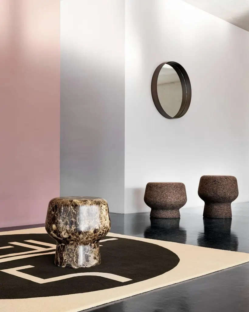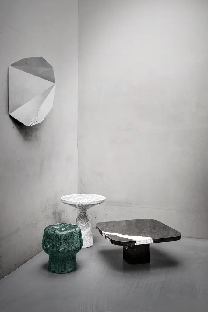 Stool or side table solid marble.New introduction from MILAN 2023Herzog & de Meuron are counted among the most innovative circle of international architectural offices. The architectural office regularly attracts great attention from media with public buildings such as stadiums and museums and initiates discourses.