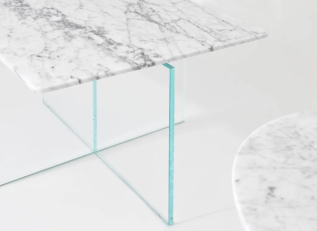 A simple table with a subtle gesture where the marble top appears to float above the glass base. Achieved by hand shaping each piece of stone, the thin edge disguises the actual thickness of marble while achieving a sense of disconnect from the glass base. The result is a unique piece that retains a feeling of fragility and delicateness combined with the rich texture of the marble top.Additional information:Materials: Carrara Giao marble, ultra-glass glassDimensions: H 22 x W 22 x D 22 inch.