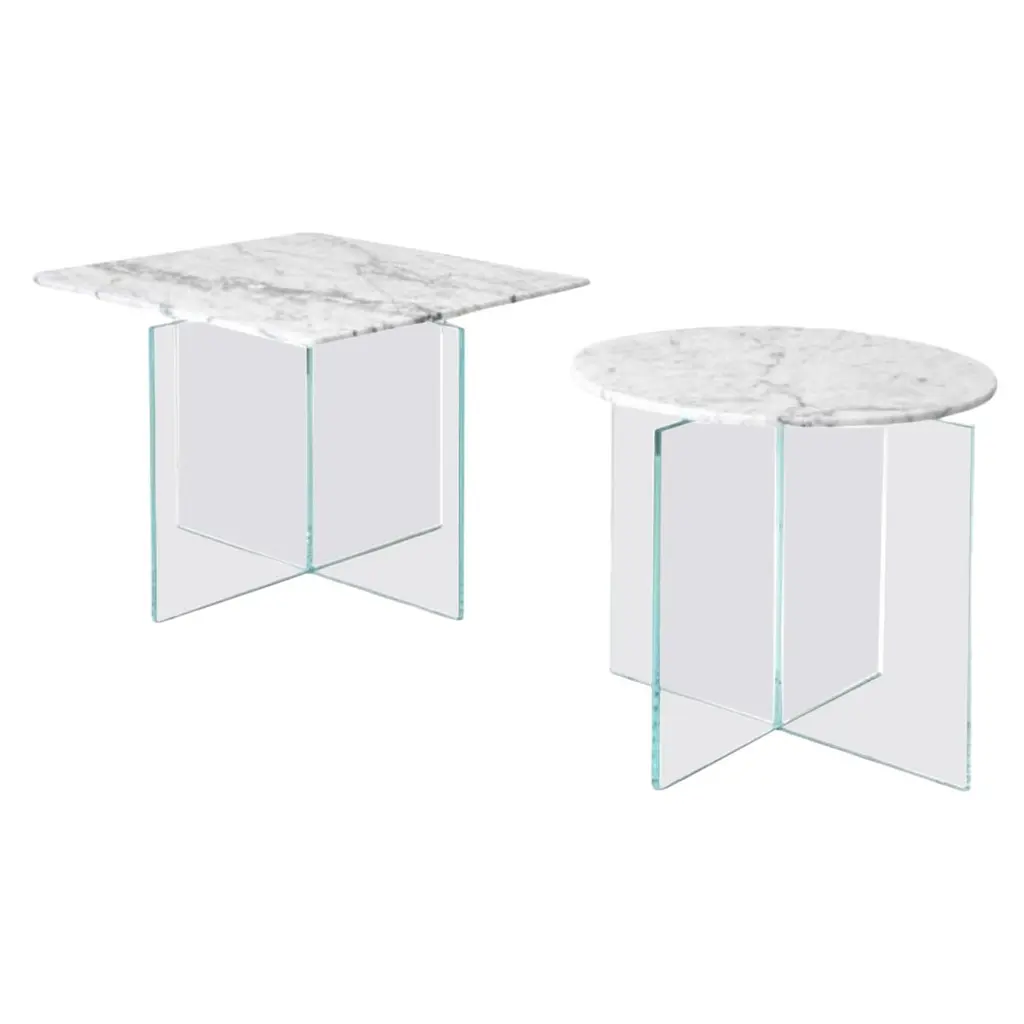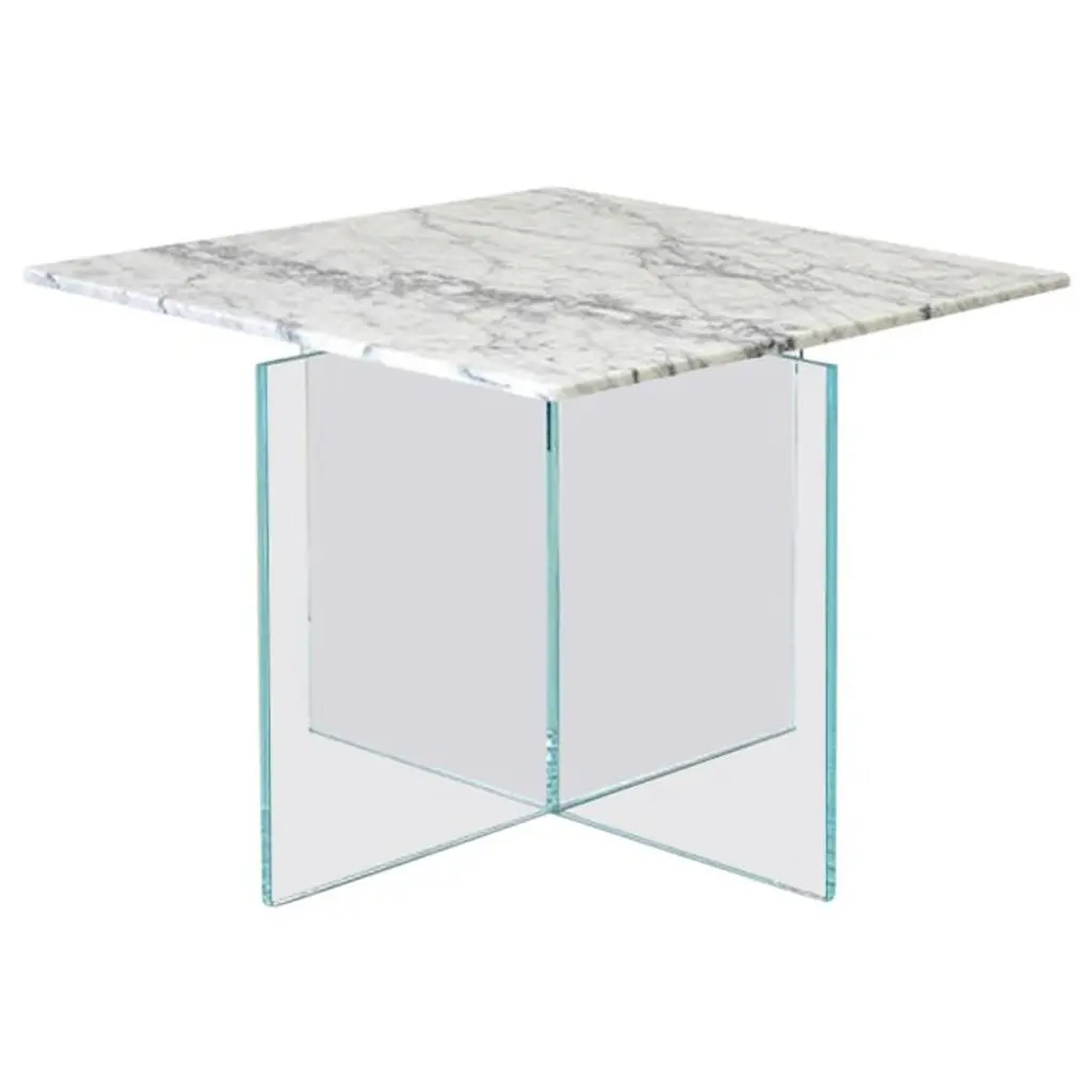 A simple table with a subtle gesture where the marble top appears to float above the glass base. Achieved by hand shaping each piece of stone, the thin edge disguises the actual thickness of marble while achieving a sense of disconnect from the glass base. The result is a unique piece that retains a feeling of fragility and delicateness combined with the rich texture of the marble top.Additional information:Materials: Cararra Giao marble, ultra-clear glassDimensions: H 22 x W 22 x D 22 inch.