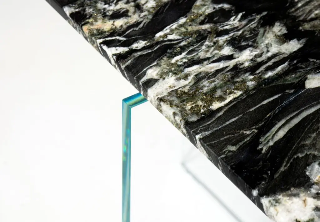 A simple table with a subtle gesture where the marble top appears to float above the glass base. Achieved by hand shaping each piece of stone, the thin edge disguises the actual thickness of marble while achieving a sense of disconnect from the glass base. The result is a unique piece that retains a feeling of fragility and delicateness combined with the rich texture of the marble top.Additional information:Materials: Belvedere black marble, ultra-glass glassDimensions: H 22 x W 18 x D 18 inch.