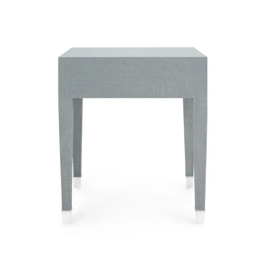 An ideal example of Villa & House’s signature use of unique finishes, the Claudette Collection is instantly eye-catching thanks to the look of its washed lacquered linen. At once both sophisticated and fresh, the material has been meticulously draped over the structured, modern form of the Claudette 1-Drawer Side Table, providing a touch of texture to its sleek, clean lines. Its soft gray color finds modern accents with custom cast brass or nickel pulls and a set of sabots, or feet, on its legs. Next to a sofa or bed, the piece provides useful storage with its floating drawer, which is set on soft closing glides and boasts stained wood interiors as the ultimate luxury.