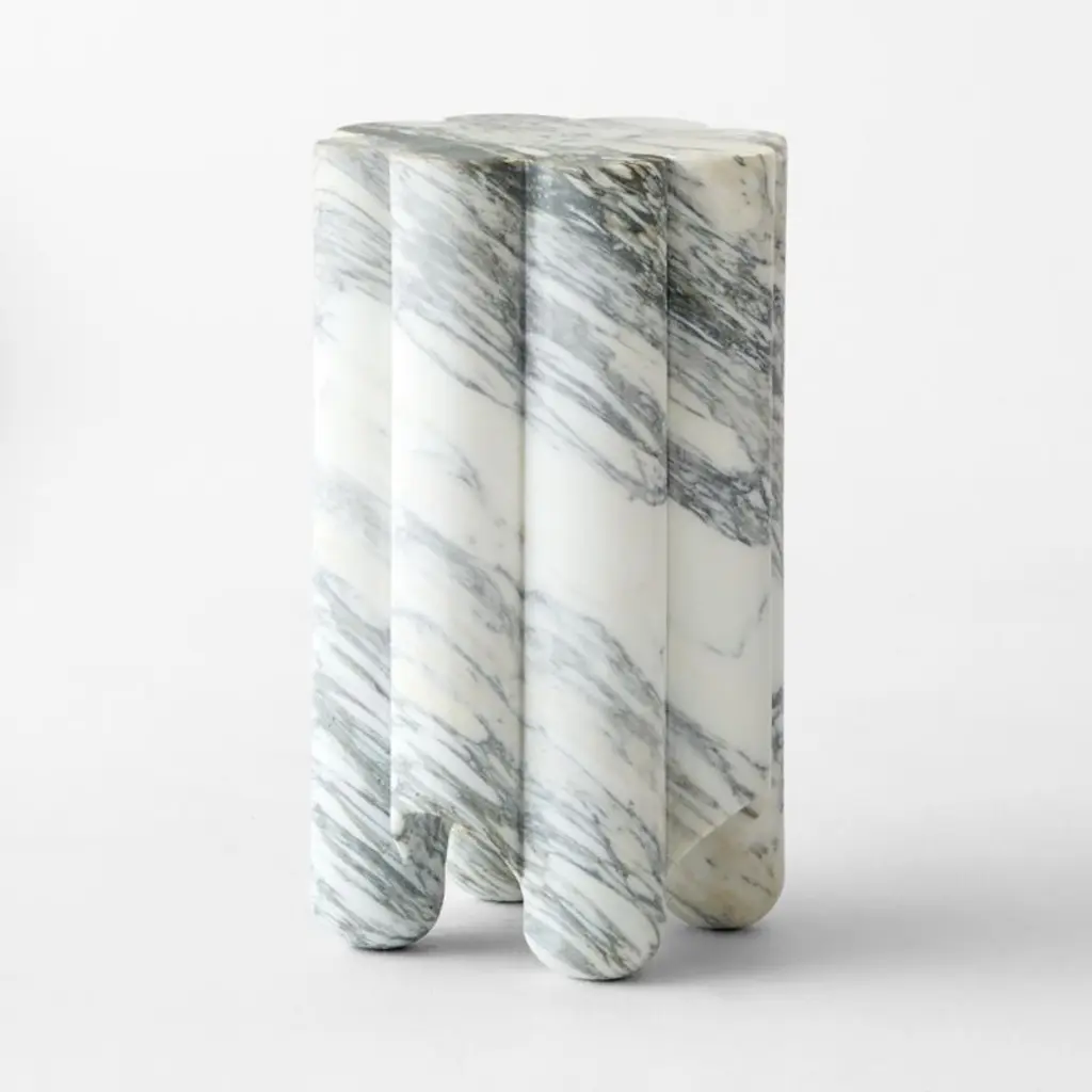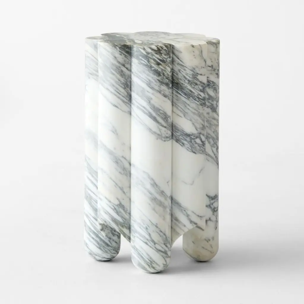 Inspired by objet d'art furniture out of Paris, the Clemence honed Italian Arabescato marble side table by goop is a work of art with an incredibly functional design. Defined by its soft curves, the side table is crafted of solid Arabescato marble that has been carefully selected, carved and polished by hand. Quarried in Chiampo, Italy, the active marble is prized for its lacy grey veining, making each table naturally one of a kind. The subtle differences in the activity of the marble are especially striking when paired with the Clemence short side table. CB2 exclusive.
