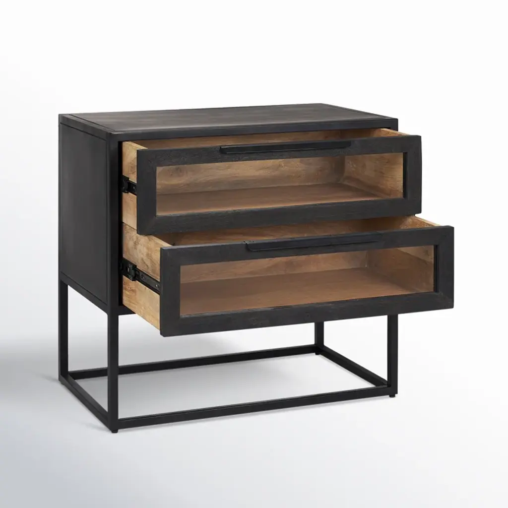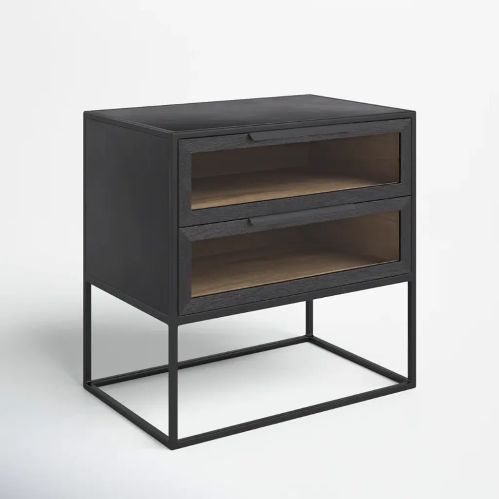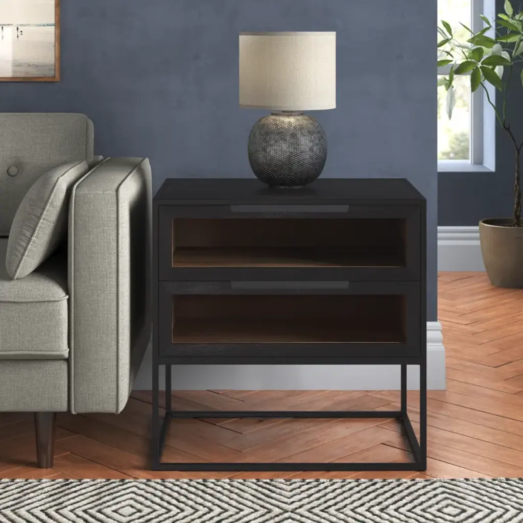 Our side table has that earthy, organic look that will cozy up any room. Bold lines and an open iron sled base are standouts, and the drawers are fronted with tempered glass paneling to expose the lighter wood interior. There's a lot of room inside for all your daily essentials. Plus, the spacious table top is the perfect platform for an accent lamp and décor.