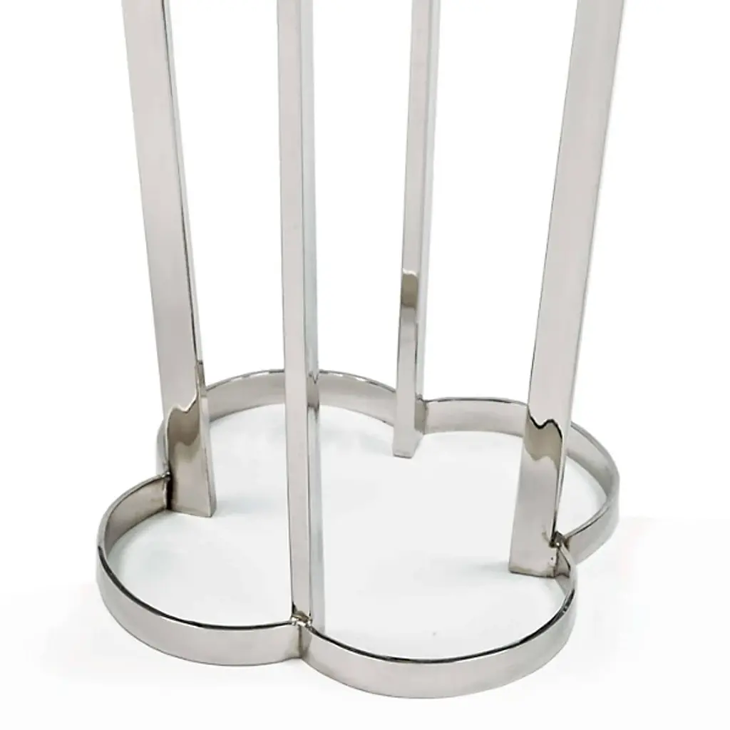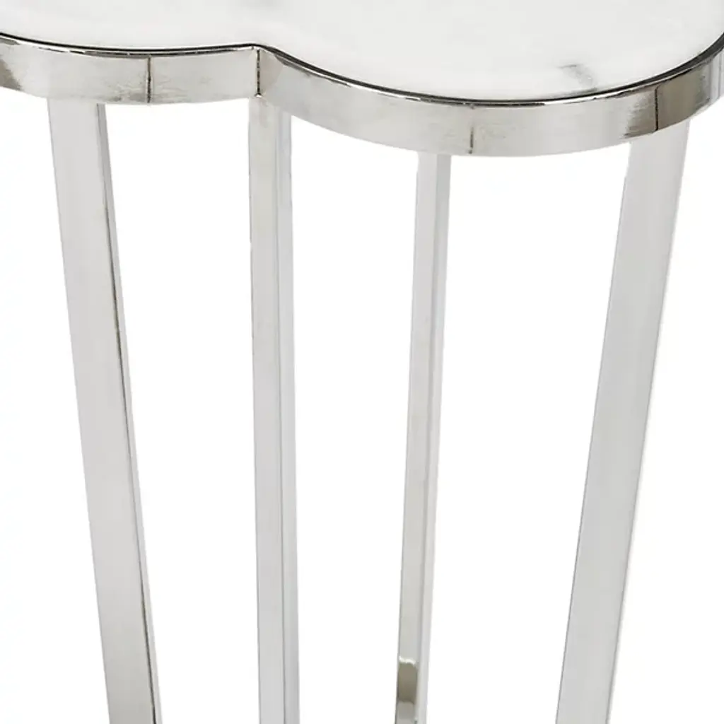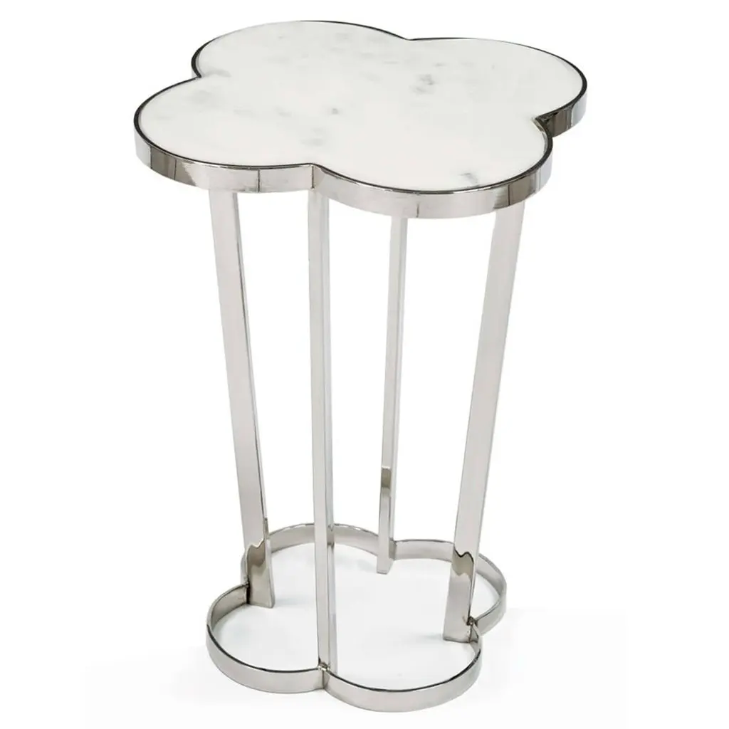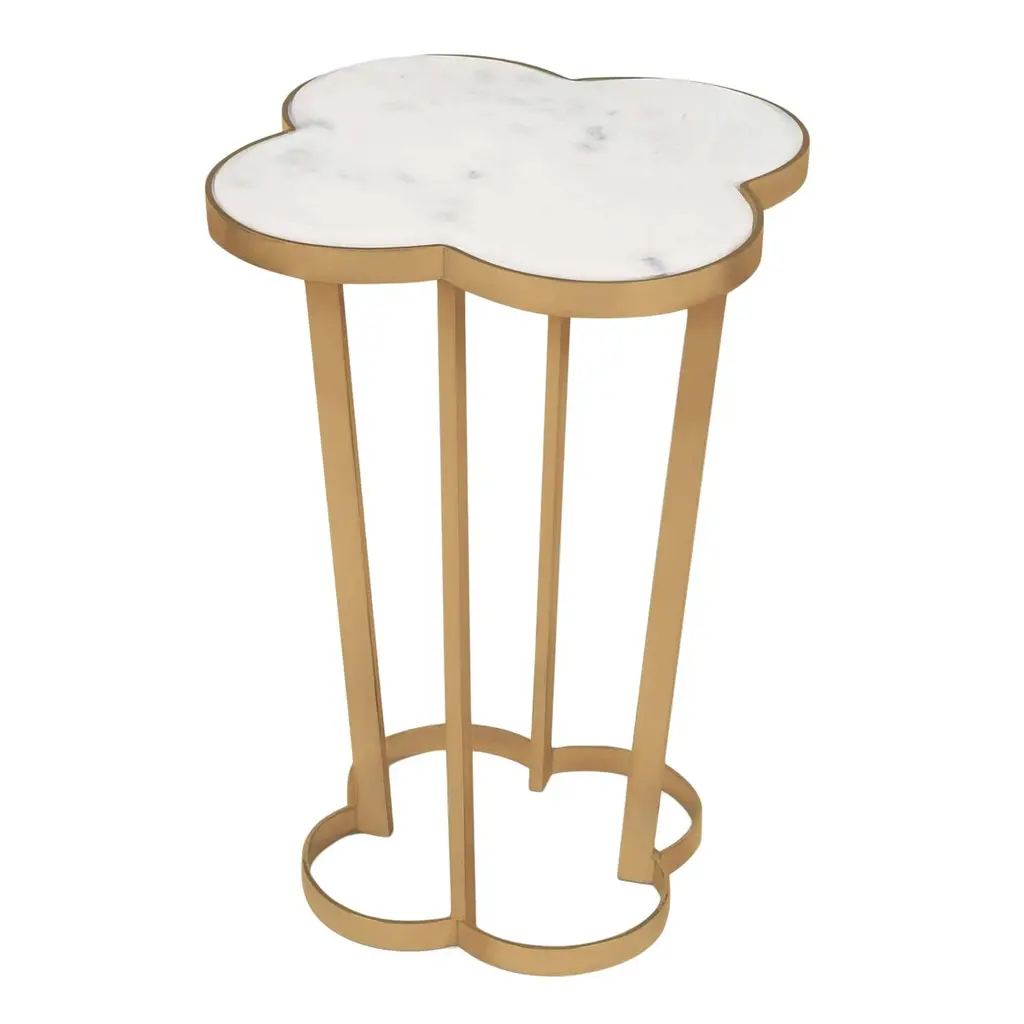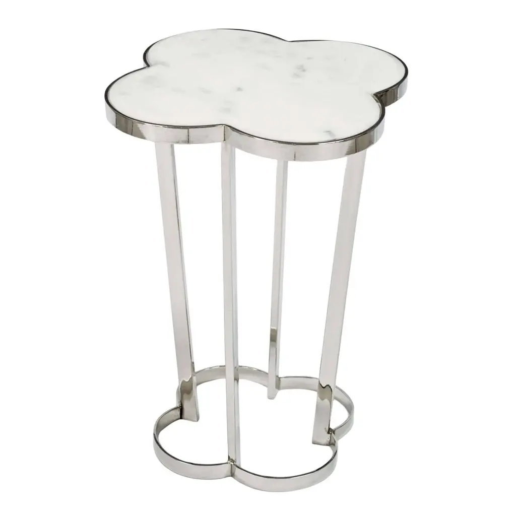The Clover Table from Regina Andrew creates charm and contemporary elegance, featuring a unique clover shape that adds a playful touch to any space. This exquisite side table is made in India and pairs a sleek steel base with a creamy white marble top set into the upper frame, creating a striking visual contrast that enhances its artistic appeal. Each piece is crafted, and features natural variations, ensuring that no two tables are alike, making it a distinctive addition to your home decor.