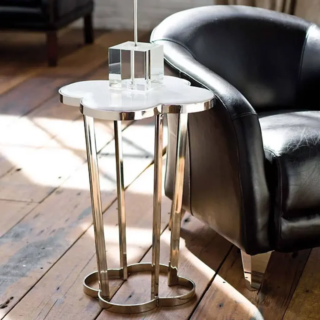 The Clover Table from Regina Andrew creates charm and contemporary elegance, featuring a unique clover shape that adds a playful touch to any space. This exquisite side table is made in India and pairs a sleek steel base with a creamy white marble top set into the upper frame, creating a striking visual contrast that enhances its artistic appeal. Each piece is crafted, and features natural variations, ensuring that no two tables are alike, making it a distinctive addition to your home decor.