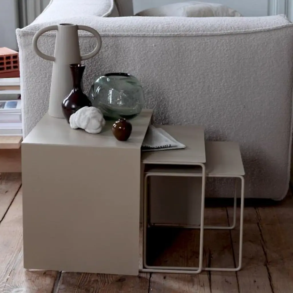 The Cluster Side Tables, Set of 3 from Ferm Living showcases how multiple items can create flexible spatial arrangements through nesting and separation. Three powder-coated steel tables in different sizes can be stacked together as a single unit or dispersed throughout various areas, allowing the configuration to shift based on need. Thin metal legs support solid tabletop surfaces, establishing a contrast between delicate framework and substantial planes. The design's modularity means the tables can function as a cohesive group or operate independently, with their relatively light construction making them easy to reposition and reconfigure over time.