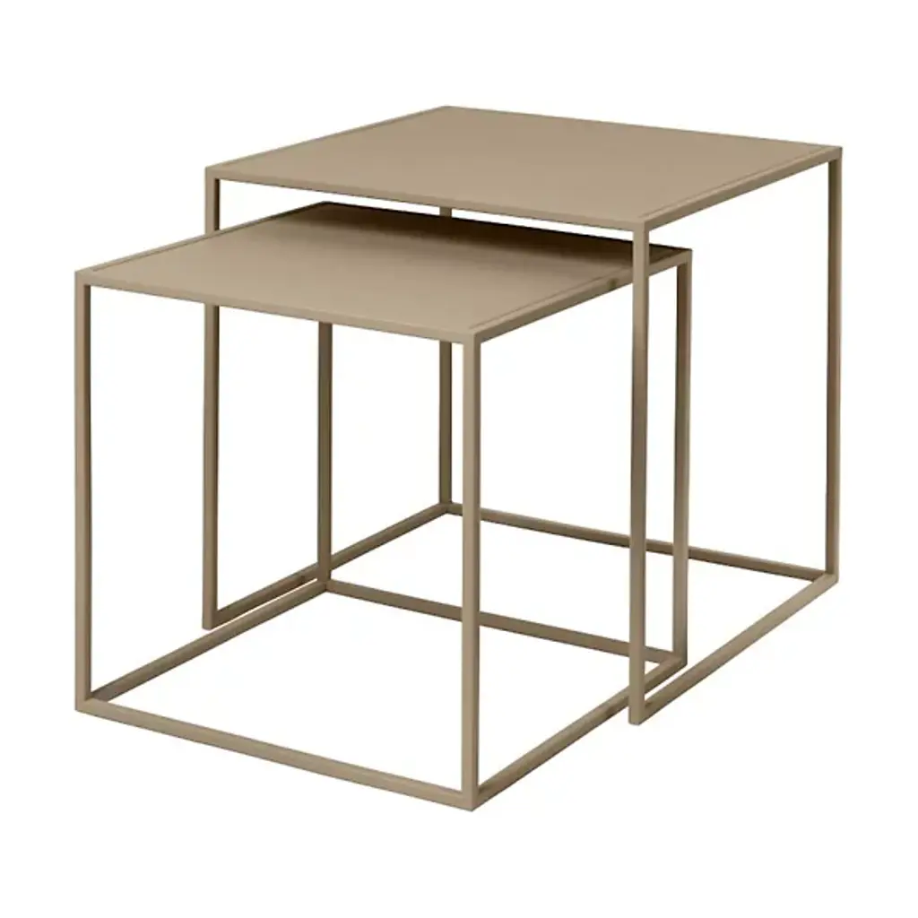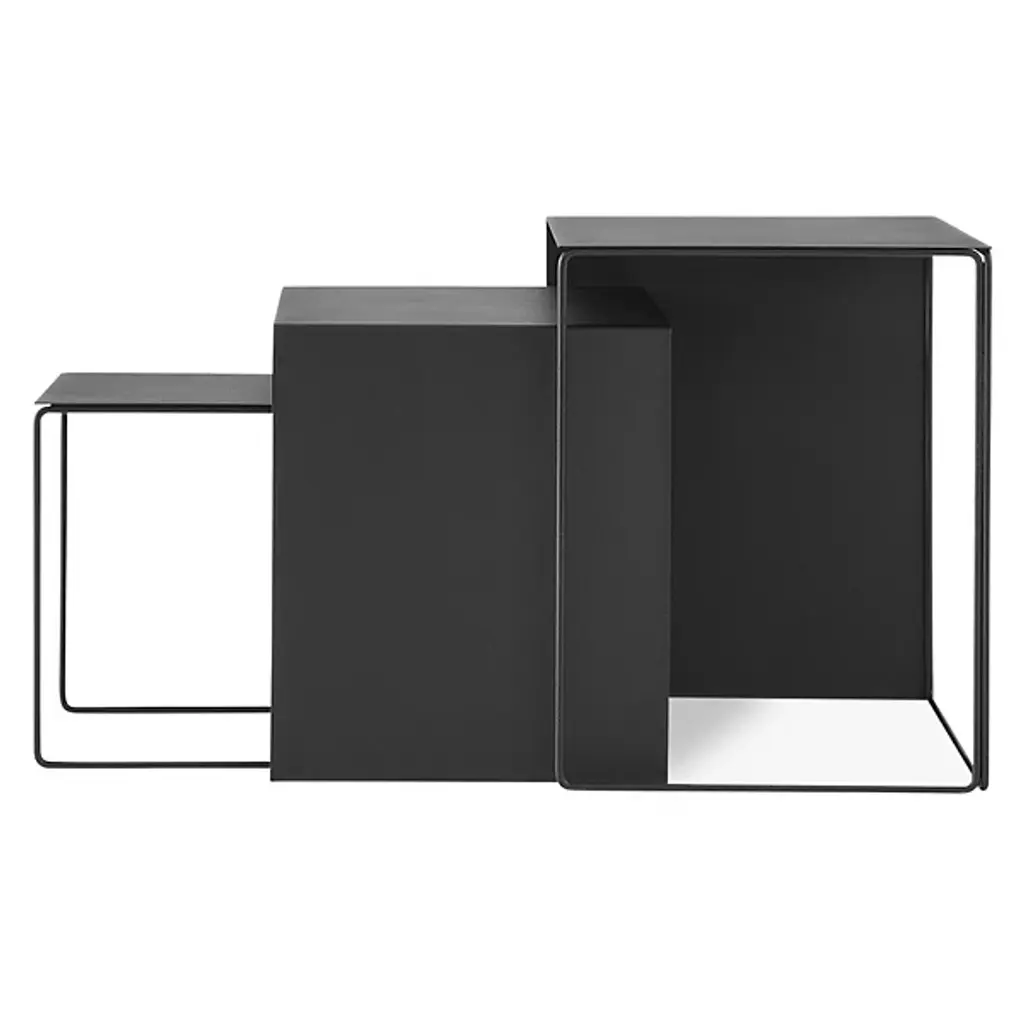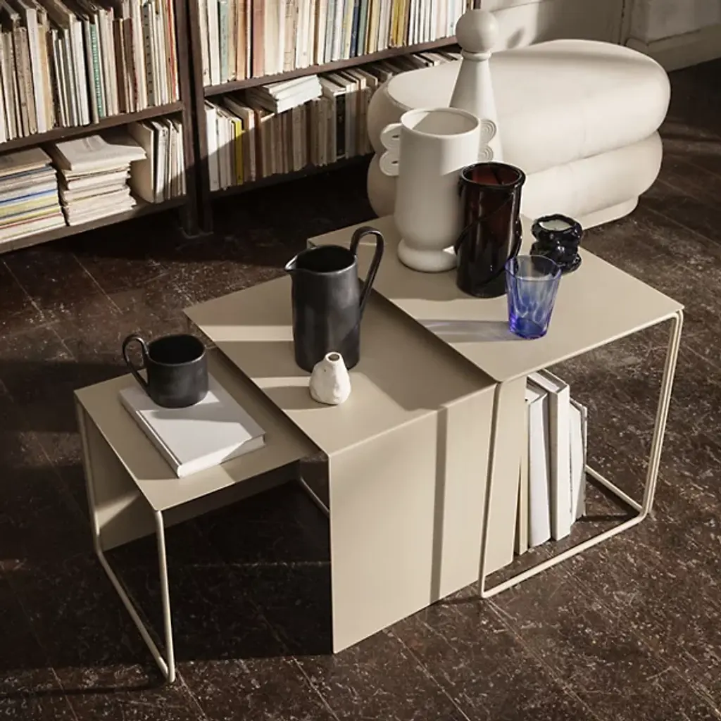 The Cluster Side Tables, Set of 3 from Ferm Living showcases how multiple items can create flexible spatial arrangements through nesting and separation. Three powder-coated steel tables in different sizes can be stacked together as a single unit or dispersed throughout various areas, allowing the configuration to shift based on need. Thin metal legs support solid tabletop surfaces, establishing a contrast between delicate framework and substantial planes. The design's modularity means the tables can function as a cohesive group or operate independently, with their relatively light construction making them easy to reposition and reconfigure over time.
