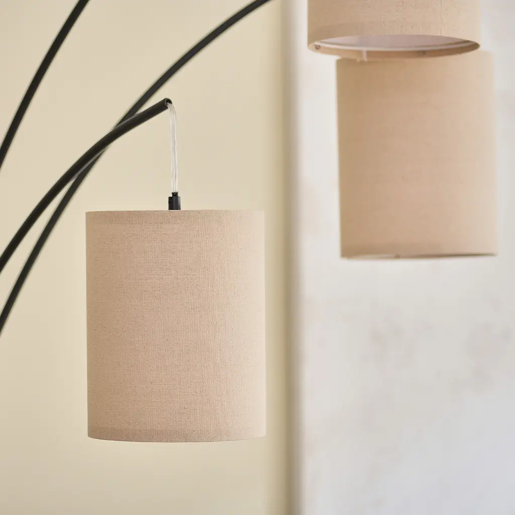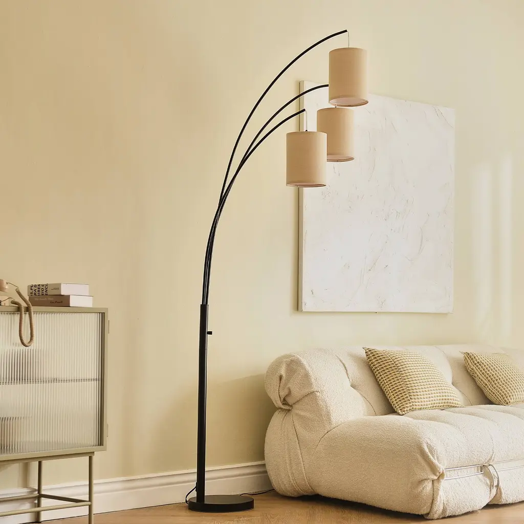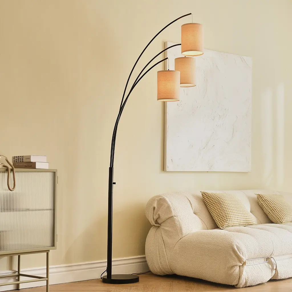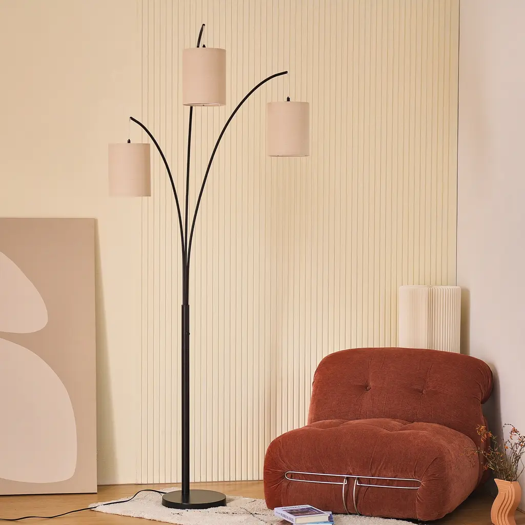 Light up your living space with this contemporary 7-foot tall arc tree floor lamp from CO-Z. Featuring a sleek metal trunk and branches, this lamp is adorned with three white fabric hanging shades that add a stylish touch to any room decor. Its secure 12-inch base and sturdy standing pole allow the three arching arms to extend out and suspend the drum shades over furniture, illuminating armchairs, side tables, or decorative pieces with a minimal floorprint. The rotary switch provides 3 levels of illumination to meet your needs, making this lamp perfect for reading, relaxing, or entertaining.Features:Specifications: