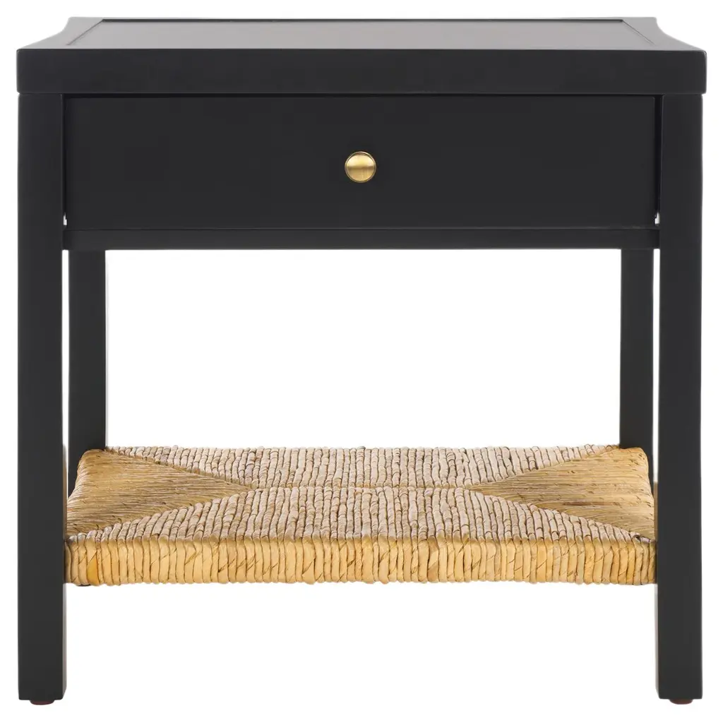 This Side Table, Crafted From Mindi Wood In A White Finish, Showcases Natural Rattan Cane Webbing On The Drawer Front And Lower Shelf. It Is Beautifully Accented With Bronze Hardware, Adding A Touch Of Contemporary Elegance To Its Design.