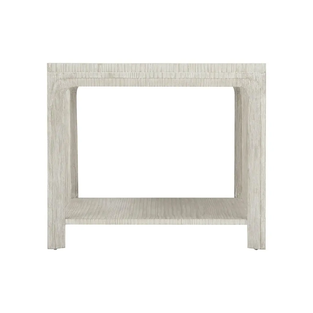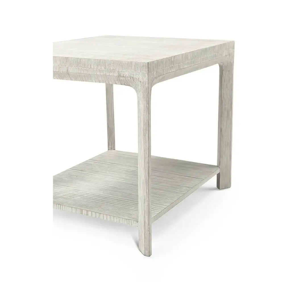 A four-legged wire-brushed cerused pine side table is supported by a bevel-shaped cross section and seen here in our Sea Salt finish.Dimensions: 24" W x 28" D x 24" H