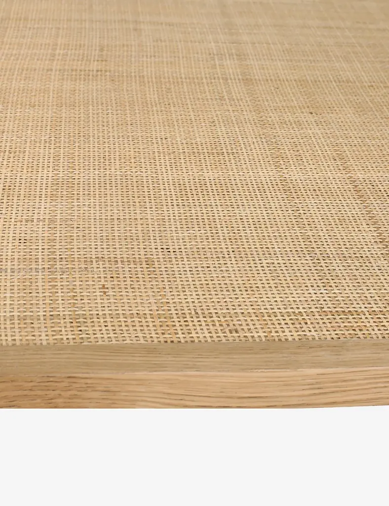 A timeless side table made with a solid oak frame, natural cane shelf, and tempered glass top that offers a warm, modern tone to any living space. The perfect end table for a relaxed, chic living room or home office.