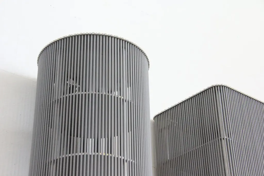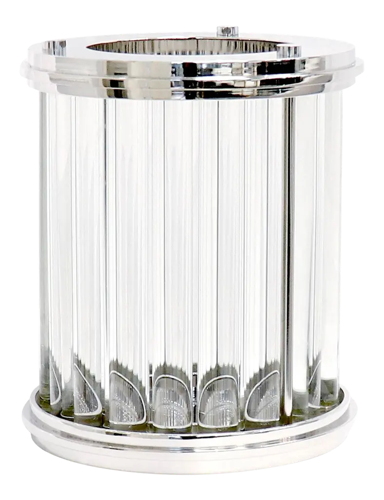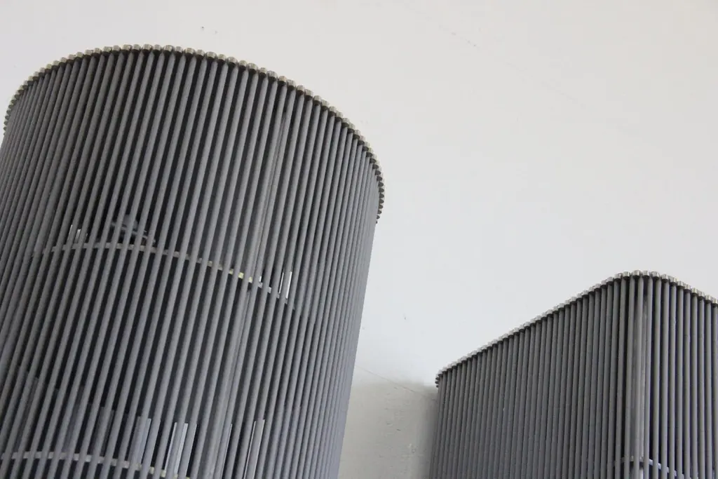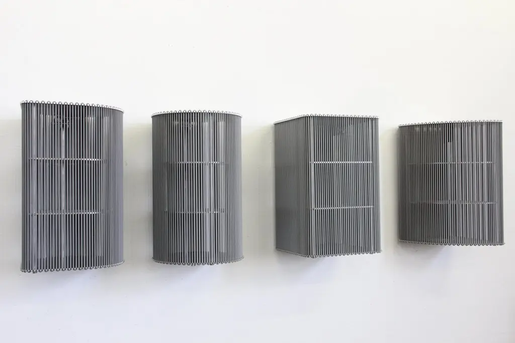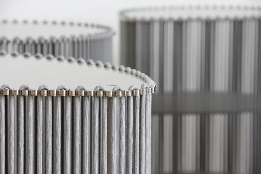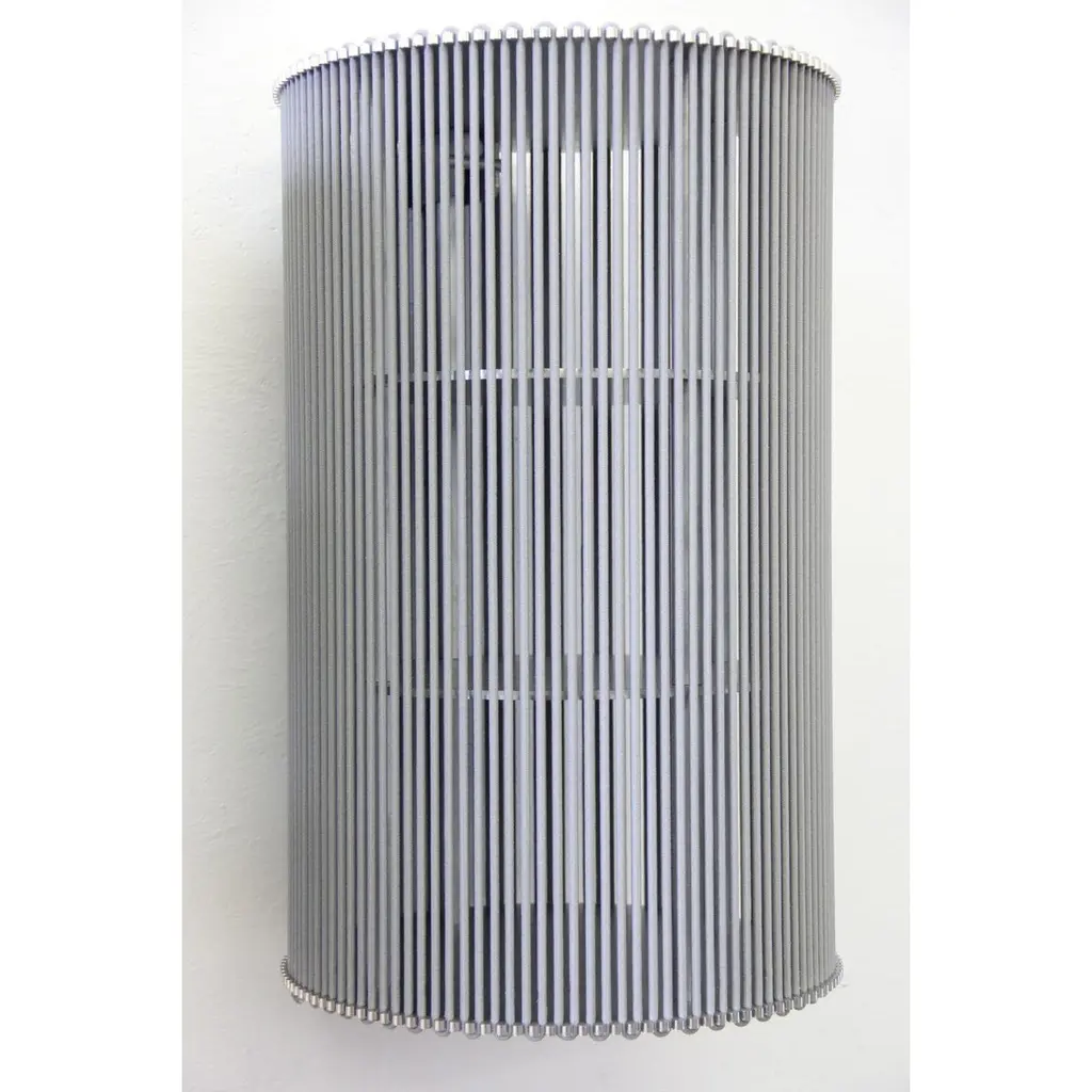 Coil circle cabinet wall mounted / side table by Bram KerkhofsDimensions: D 40 x W 40 x H 75.2cmMaterials:Stainless steel, aluminium, elastic rope (natural rubber, polyethylene).Other dimensions are available.COIL is a modular cabinet system in which the ‘shell’ is formed completely around a base as a semi-transparent curtain from a vertical and parallel woven elastic rope. It forms the middle between a classic open rack and a display cabinet and can be used on all sides. Coil redefines the cabinet as an object in its use. To put something in or to get it out, the elastics have to be pushed aside. Coil is a good example to clarify my dealings with materials and their properties. To be able to attach the elastic rope, the rope must be stretched so that the rope becomes thinner. The top and bottom shelf of the cabinet are provided with a specific cut-out curve at the edge so that the stretched elastic can be inserted, after which it relaxes nicely in the recessed opening. Due to its modular construction, the coil can vary in height by 40 cm each. The inner shelves are slightly smaller. This keeps them away from the screen. Coil has a fixed rounded rectangular format of 40 x 80 cm (W x H) and can be combined with quarter circle modules with a radius of 40 and 80 cm. This makes it possible to build freestanding walls as a composition of curved and straight forms, as functional room dividers.BRAM KERKHOFS (° 1977) is a Belgian furniture designer looking for new forms and methods to challenge the functionality and flexibility of a furniture piece. Educated as a goldsmith he is fascinated by connections, hinges, knots and joints, and especially by the functional opportunities they generate. His work is filled with mathematical principles resulting in intelligible algorithms to make them understandable. He draws particular attention to the relationship between construction and material, bringing simplicity into complexity, with a lasting alertness to the final function. This time-intensive design and development process results in innovative construction systems automatically expressing his signature. Many of his designs must be seen in a bigger picture, as parts to a whole, in which he explores the endless possibilities for links, combinations and variations. Bram wants to clarify complex constructions and gives the consumer and the spectator insight into his thinking process. That is why his work partly revolves around people, as the manipulators of his modular furniture, but above all, Bram aims to influence through collaborations with his interns, apprentices and students and with the wider world around him through workshops and lectures al around the globe.