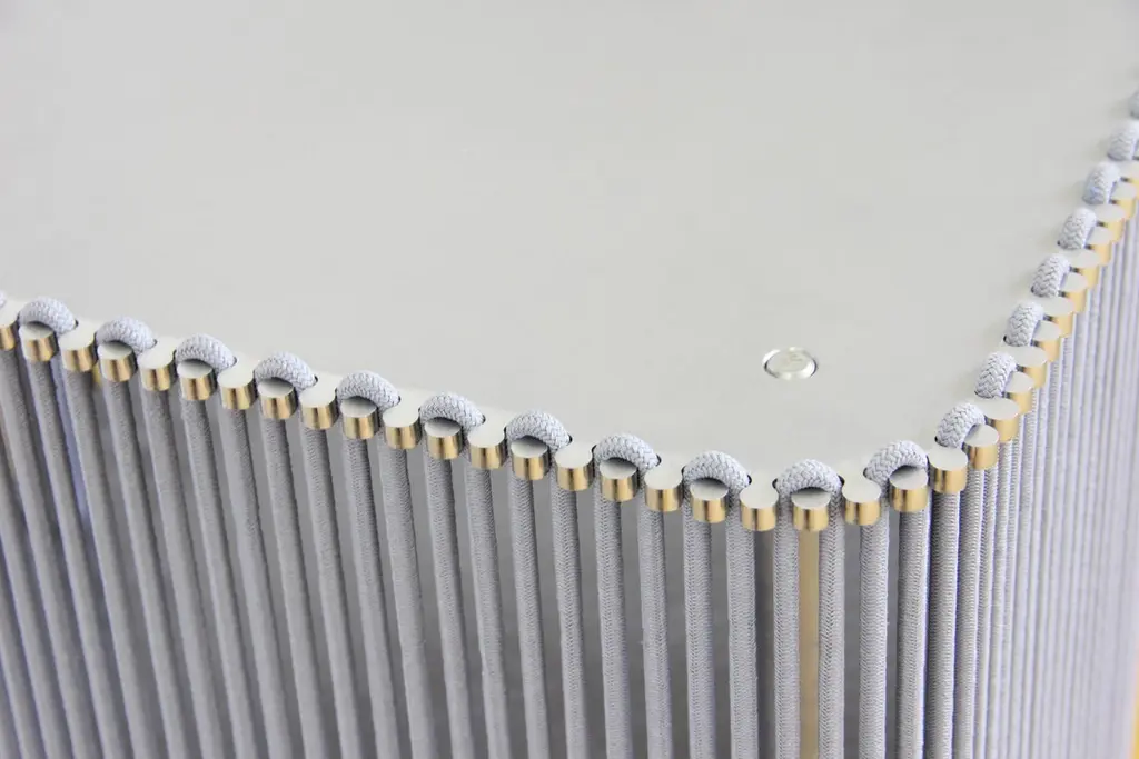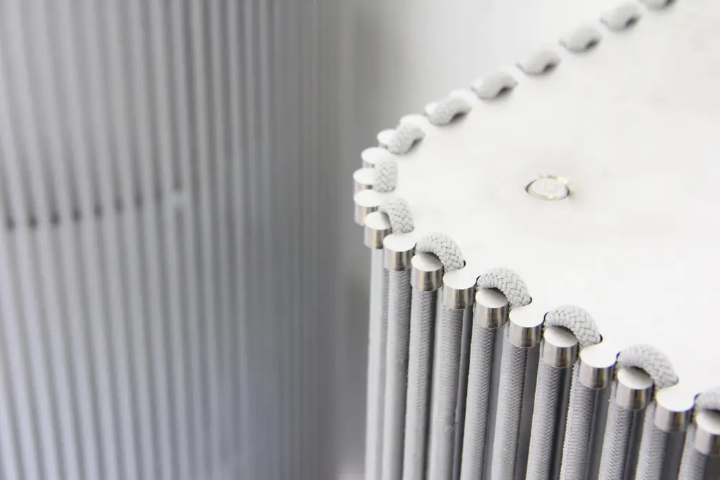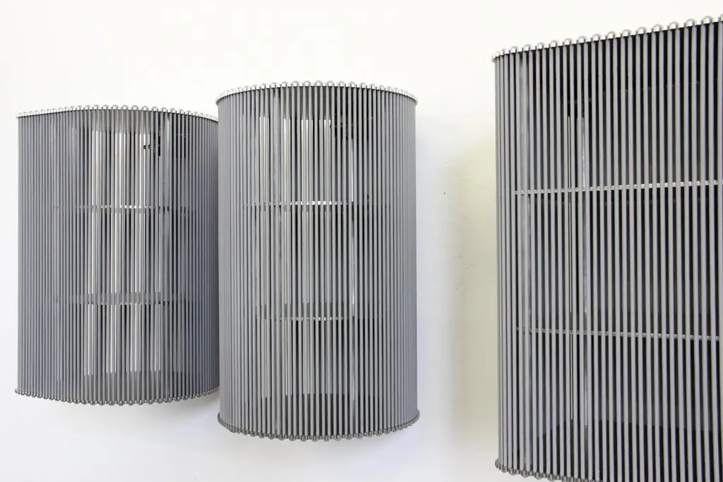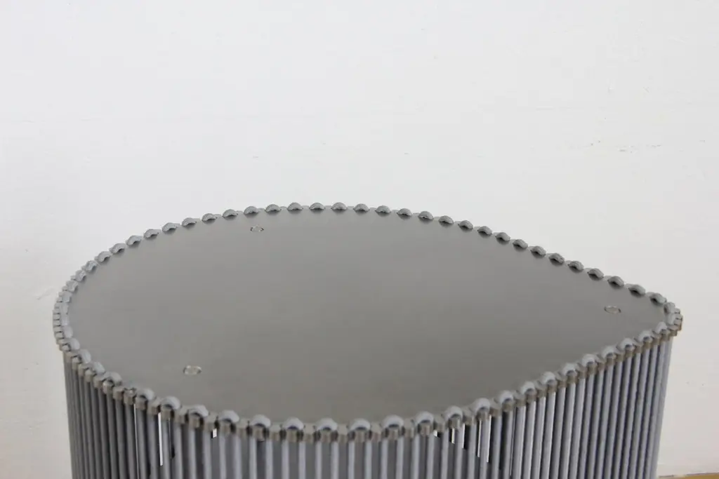 Coil drop cabinet wall mounted/ side table by Bram KerkhofsDimensions: D 40 x W 40 x H 75.2cmMaterials:Stainless steel, aluminium, elastic rope (natural rubber, polyethylene).Other dimensions are available.COIL is a modular cabinet system in which the ‘shell’ is formed completely around a base as a semi-transparent curtain from a vertical and parallel woven elastic rope. It forms the middle between a classic open rack and a display cabinet and can be used on all sides. Coil redefines the cabinet as an object in its use. To put something in or to get it out, the elastics have to be pushed aside. Coil is a good example to clarify my dealings with materials and their properties. To be able to attach the elastic rope, the rope must be stretched so that the rope becomes thinner. The top and bottom shelf of the cabinet are provided with a specific cut-out curve at the edge so that the stretched elastic can be inserted, after which it relaxes nicely in the recessed opening. Due to its modular construction, the coil can vary in height by 40 cm each. The inner shelves are slightly smaller. This keeps them away from the screen. Coil has a fixed rounded rectangular format of 40 x 80 cm (W x H) and can be combined with quarter circle modules with a radius of 40 and 80 cm. This makes it possible to build freestanding walls as a composition of curved and straight forms, as functional room dividers.BRAM KERKHOFS (° 1977) is a Belgian furniture designer looking for new forms and methods to challenge the functionality and flexibility of a furniture piece. Educated as a goldsmith he is fascinated by connections, hinges, knots and joints, and especially by the functional opportunities they generate. His work is filled with mathematical principles resulting in intelligible algorithms to make them understandable. He draws particular attention to the relationship between construction and material, bringing simplicity into complexity, with a lasting alertness to the final function. This time-intensive design and development process results in innovative construction systems automatically expressing his signature. Many of his designs must be seen in a bigger picture, as parts to a whole, in which he explores the endless possibilities for links, combinations and variations. Bram wants to clarify complex constructions and gives the consumer and the spectator insight into his thinking process. That is why his work partly revolves around people, as the manipulators of his modular furniture, but above all, Bram aims to influence through collaborations with his interns, apprentices and students and with the wider world around him through workshops and lectures al around the globe.