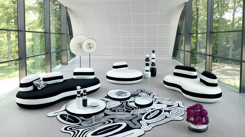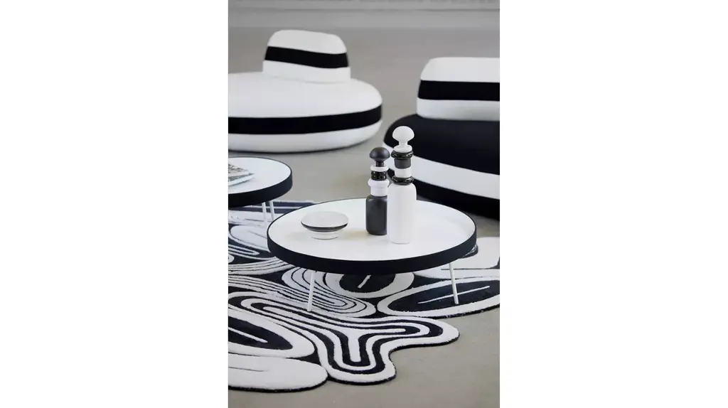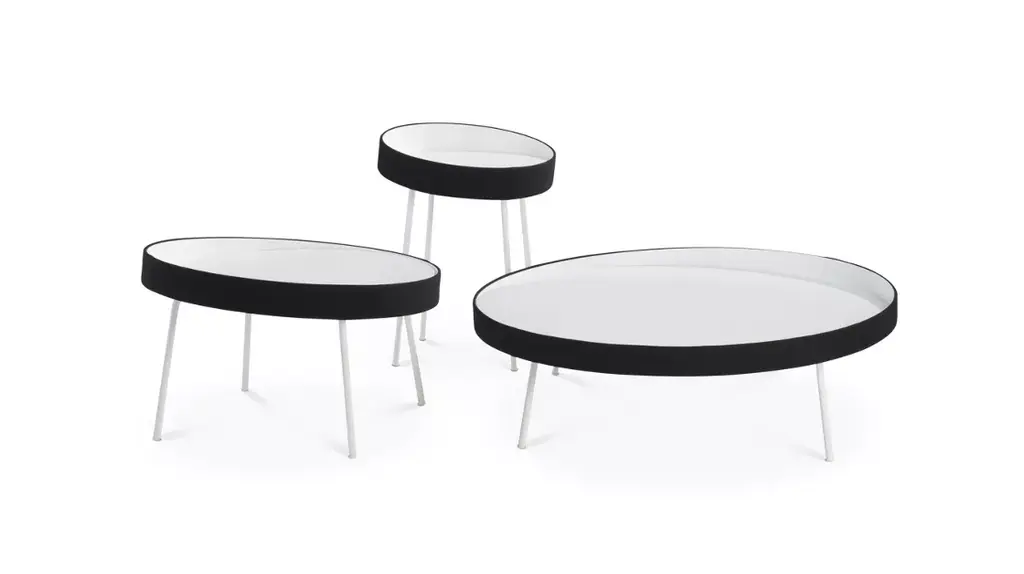 Coin is a collection of tables with a rounded and deliberately unbalanced shape, inspired by the movement of a spinning coin. Their ring is upholstered in (almost!) all the fabrics from the Roche Bobois collection.