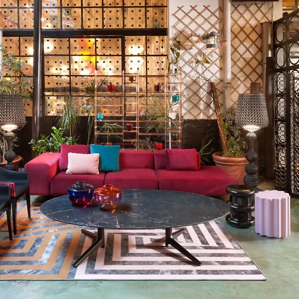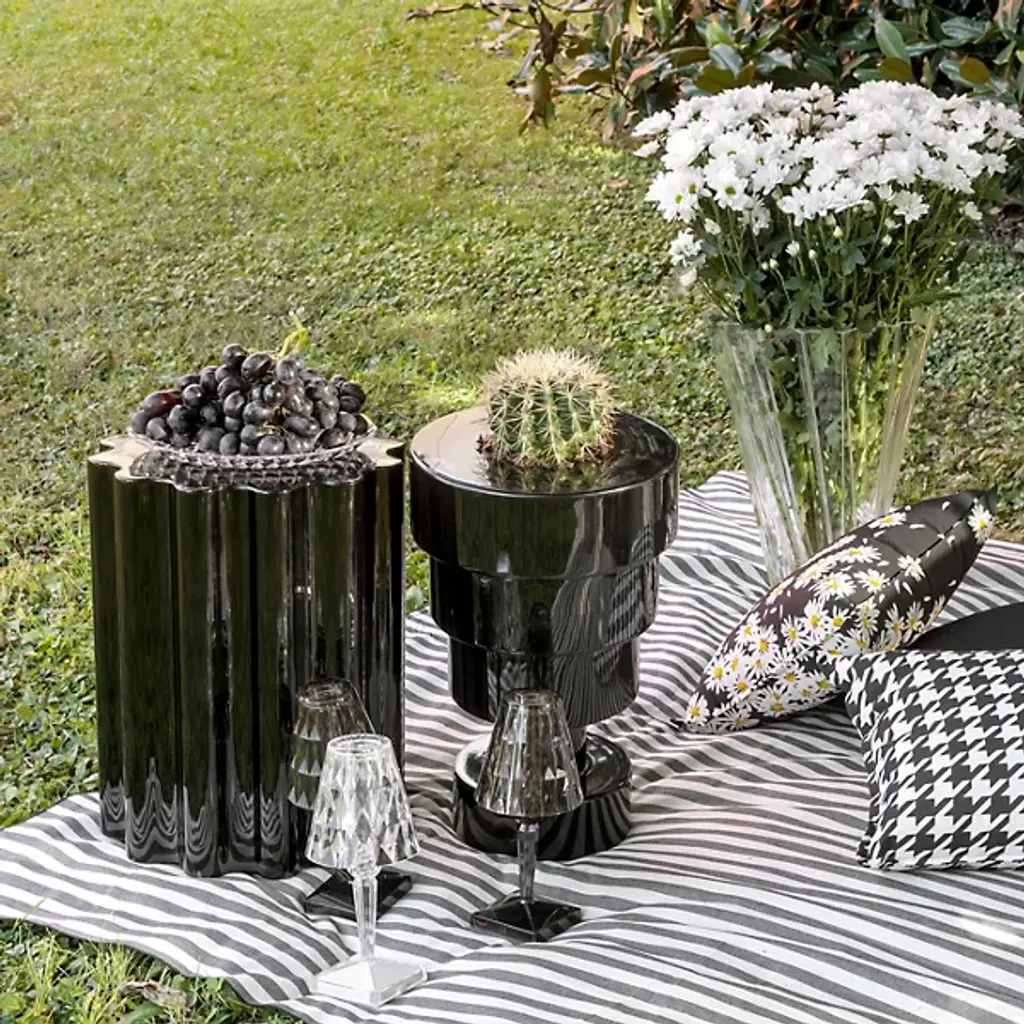 The Colonna Side Table from Kartell celebrates the Memphis design movement through Ettore Sottsass's architectural vision. This painted batch-dyed thermoplastic technopolymer piece functions as both a stool and a side table, offering dual functionality in compact spaces. Part of the special "Kartell goes Sottsass - A Tribute to Memphis" collection, it brings postmodern design principles into contemporary interiors. The table works well next to sofas for holding drinks and books or as extra seating when guests arrive. Its vibrant personality makes it particularly suitable for creative spaces, studios, or anywhere bold design statements are welcomed.