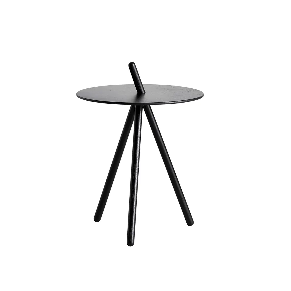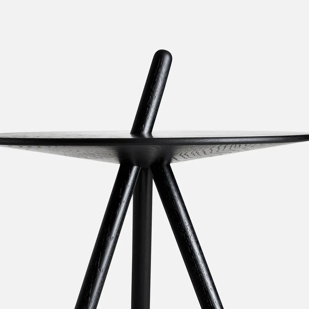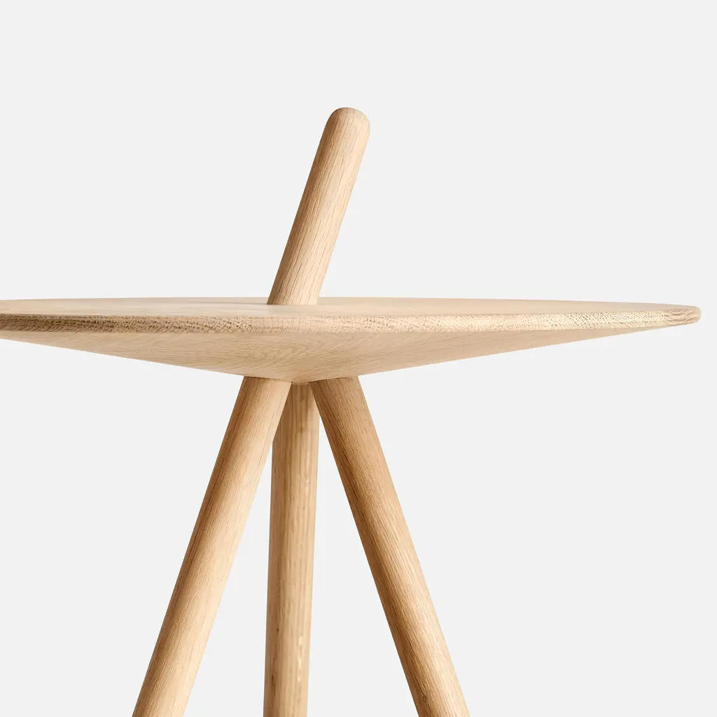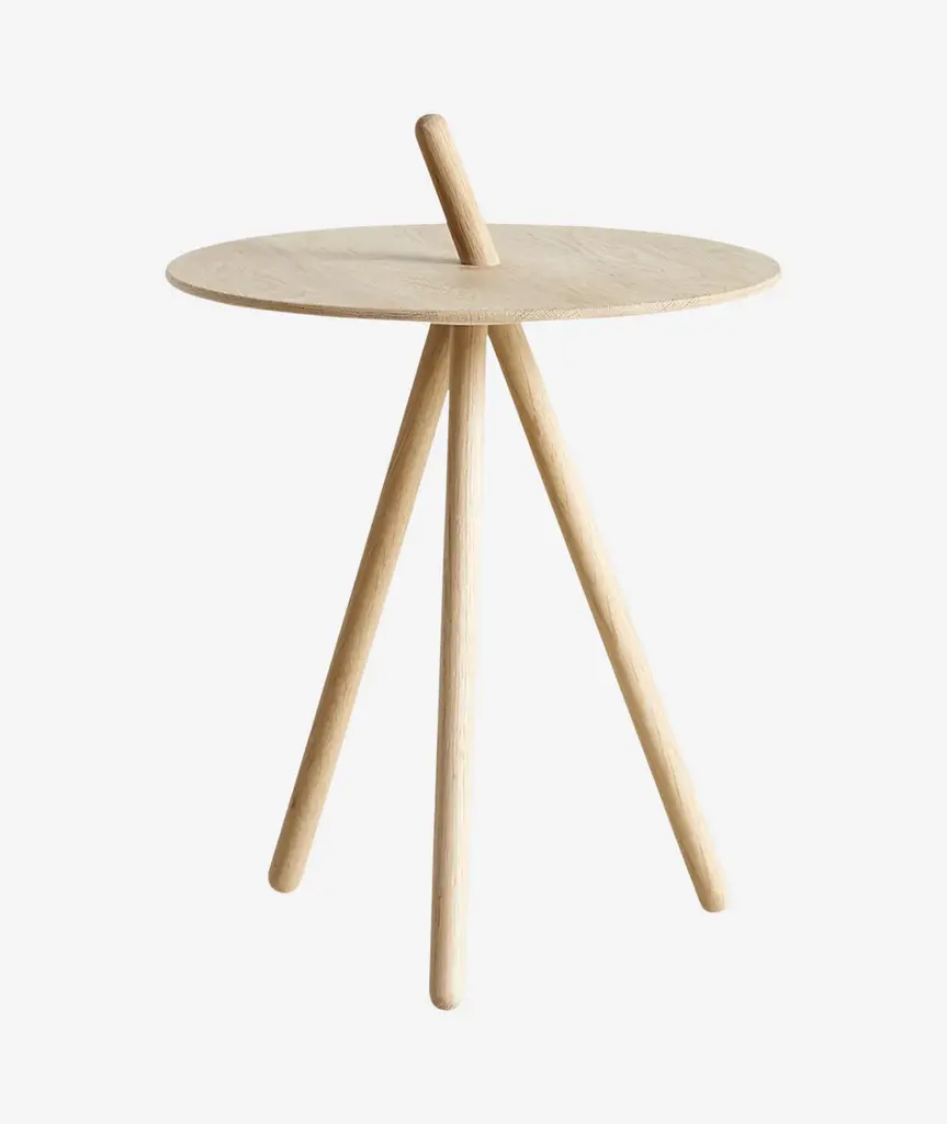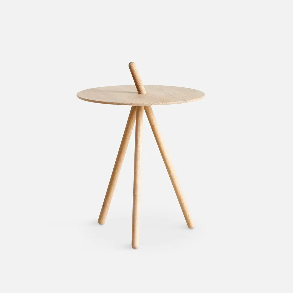 The “Come Here” side table is a testament to minimalist Scandinavian craftsmanship, a piece that complements and enhances any interior space with its understated charm. Crafted with a keen eye for detail, the table boasts a solid oak construction, known for its durability and fine grain. Its round tabletop provides a smooth, inviting surface, perfect for holding your morning cup of coffee or an array of your favorite books. Function melds with form as one of the three svelte legs pierces the surface, emerging as a convenient handle. This inventive design touch not only adds a unique aesthetic flair but also increases the table’s practicality, allowing for effortless repositioning to suit your changing needs. Whether it stands by your bedside, offering a rest for nighttime essentials, or nestles by a cozy armchair, holding a lamp to illuminate your reading nook, the “Come Here” side table is a versatile companion in any room. Its presence is both functional and sculptural, a delightful addition that complements the modern home with its simplicity and utility.