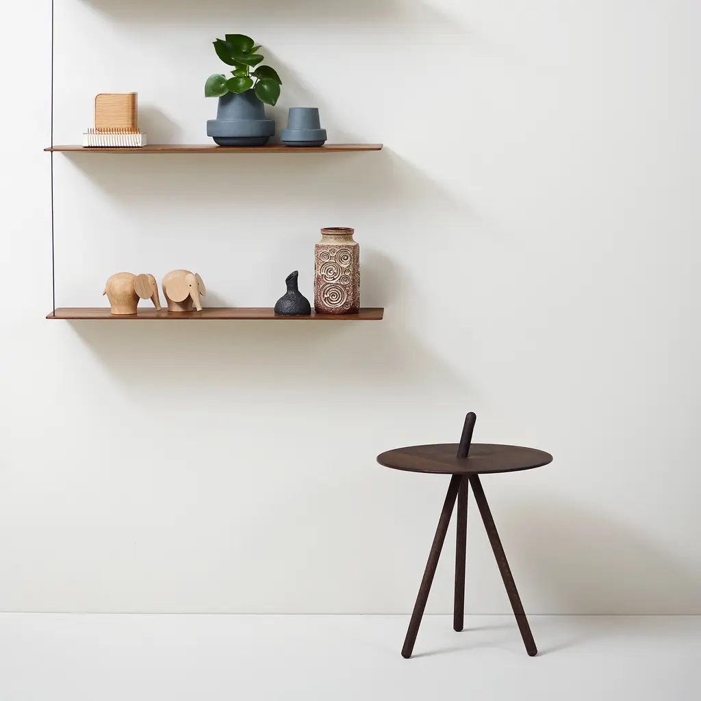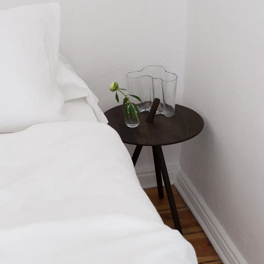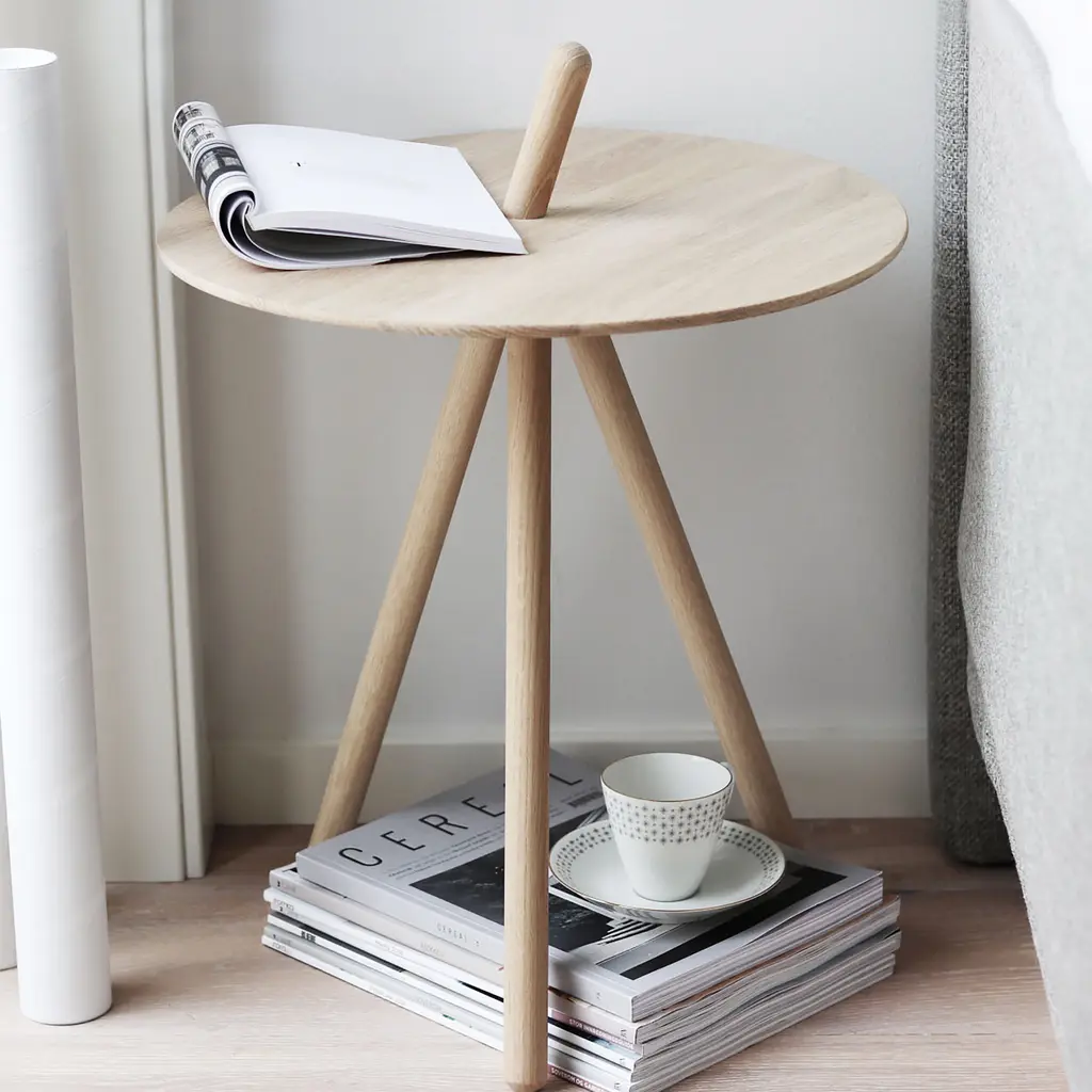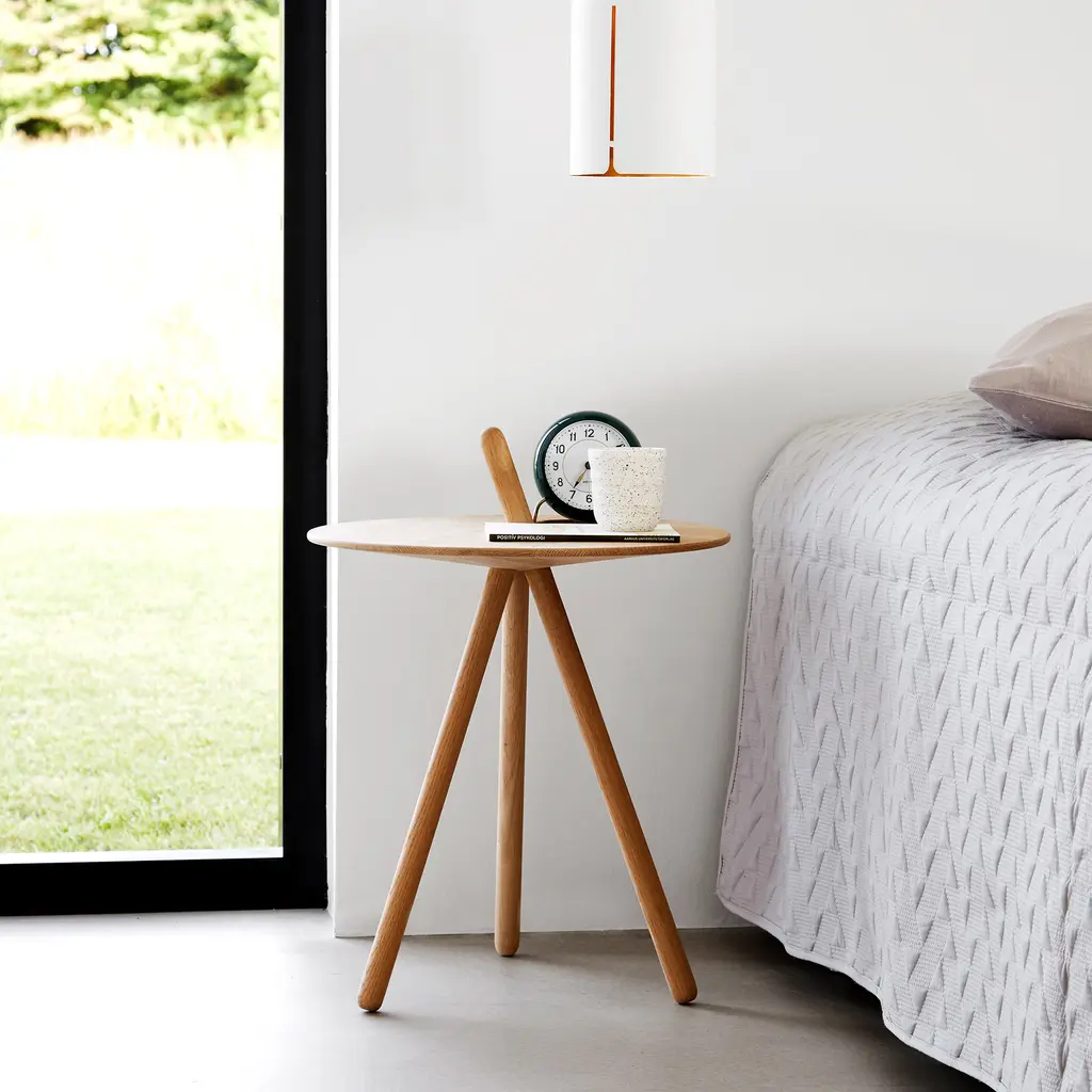 The “Come Here” side table is a testament to minimalist Scandinavian craftsmanship, a piece that complements and enhances any interior space with its understated charm. Crafted with a keen eye for detail, the table boasts a solid oak construction, known for its durability and fine grain. Its round tabletop provides a smooth, inviting surface, perfect for holding your morning cup of coffee or an array of your favorite books. Function melds with form as one of the three svelte legs pierces the surface, emerging as a convenient handle. This inventive design touch not only adds a unique aesthetic flair but also increases the table’s practicality, allowing for effortless repositioning to suit your changing needs. Whether it stands by your bedside, offering a rest for nighttime essentials, or nestles by a cozy armchair, holding a lamp to illuminate your reading nook, the “Come Here” side table is a versatile companion in any room. Its presence is both functional and sculptural, a delightful addition that complements the modern home with its simplicity and utility.