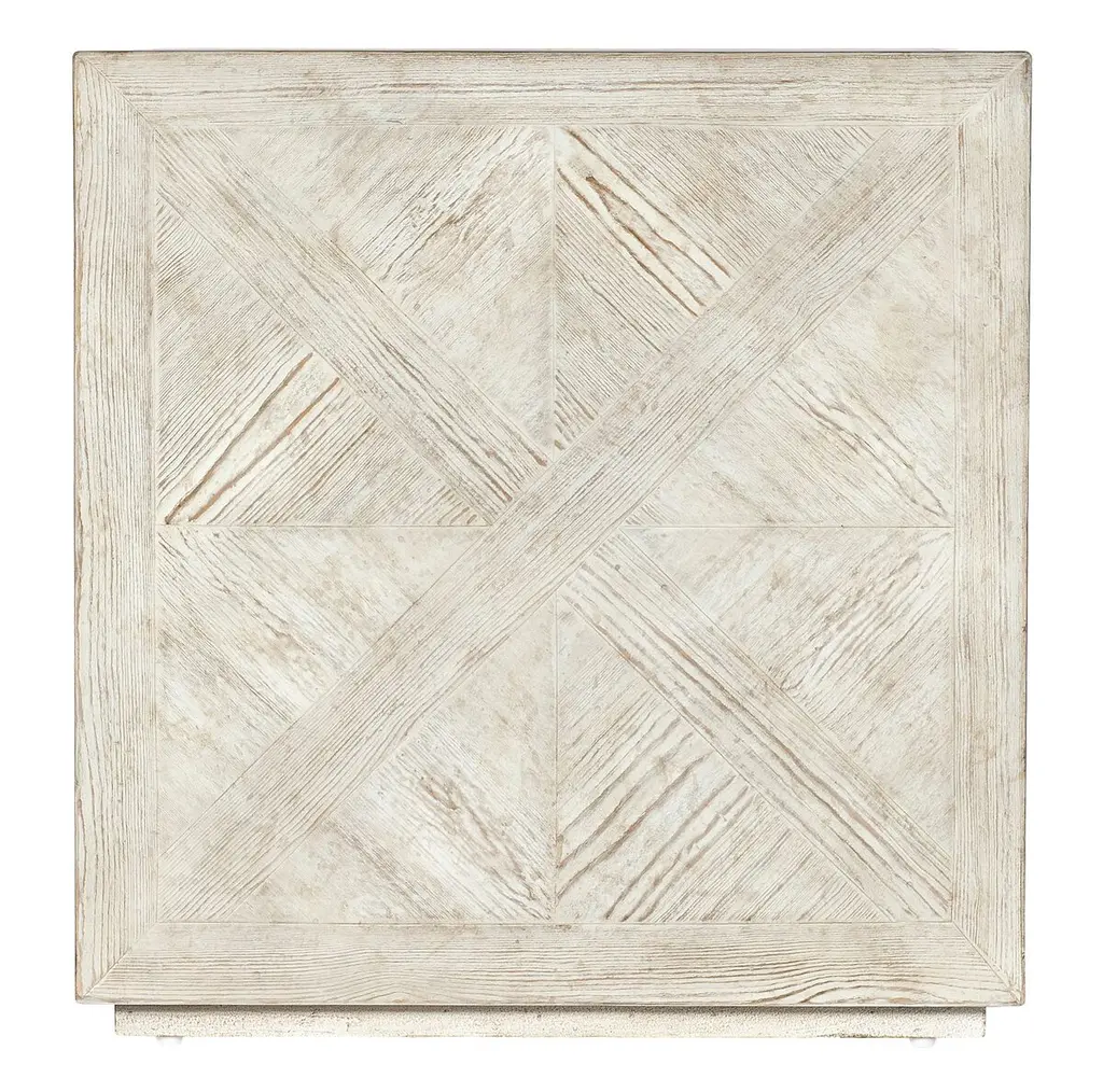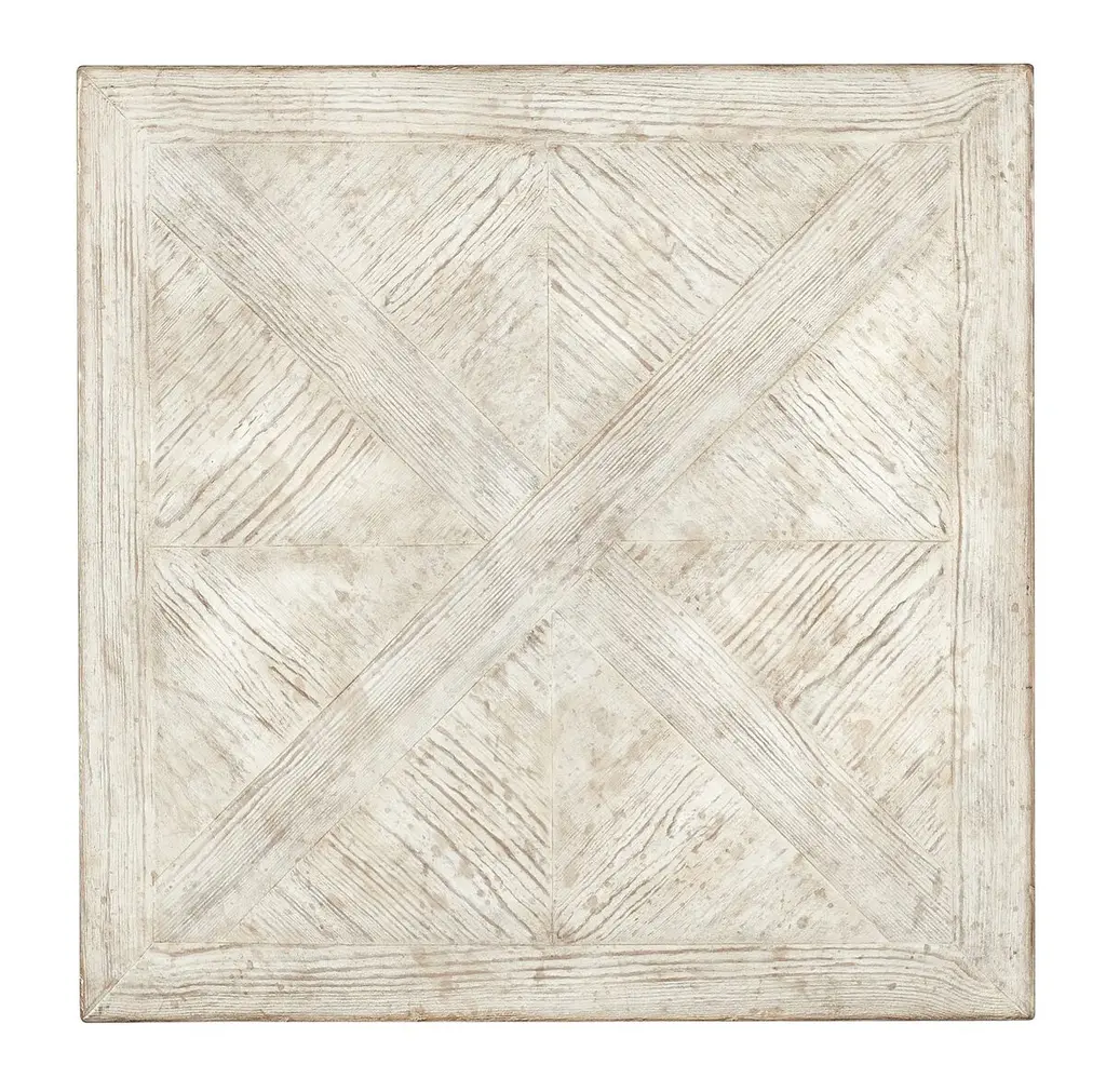 In a cube-like form, the 24-inch square Block Buster End Table is crafted of Pine with parquet-patterned veneers in a creamy white finish with rub-through and distressing and a plinth base.