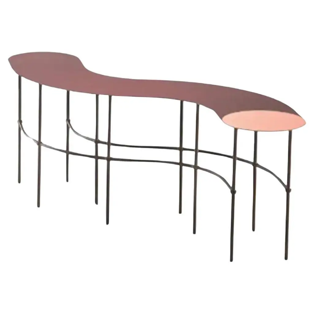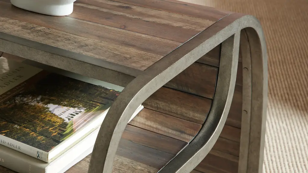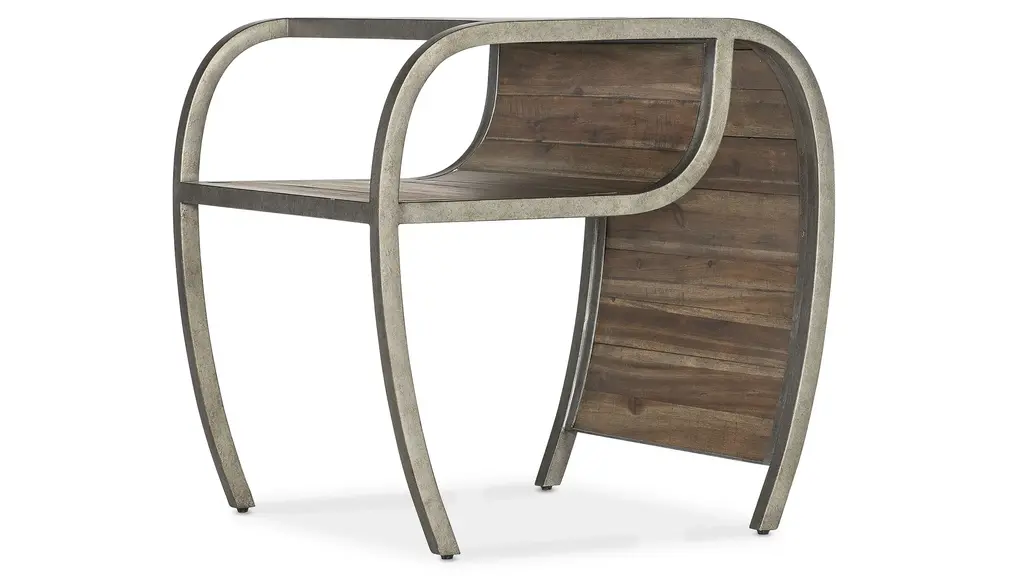 Commerce & Market End Table combines a pewter metal frame with a planked-wood motif in a natural medium wood finish with distressing and visible knots. The curved design has one fixed shelf.