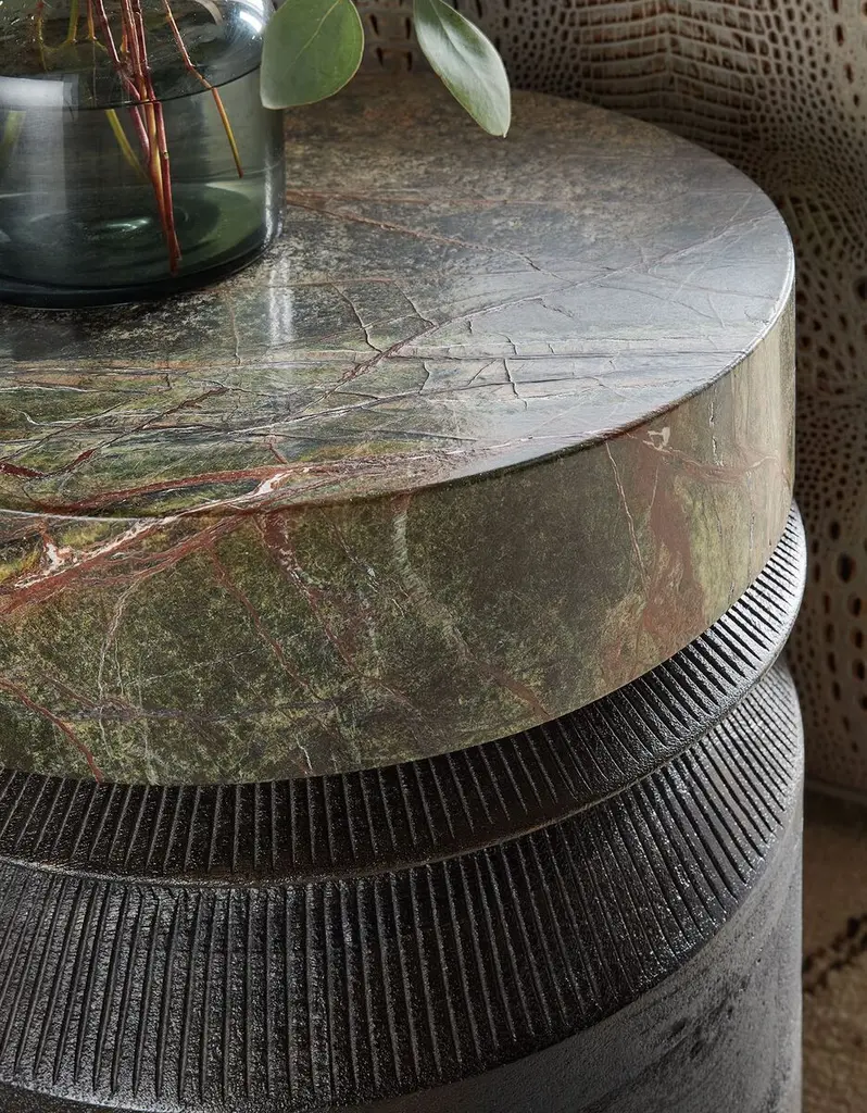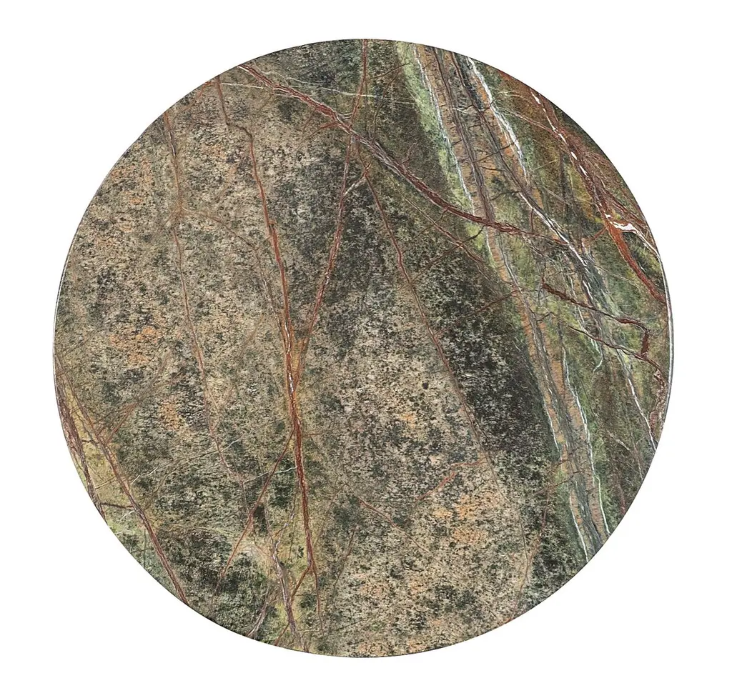 With a pottery-like feel, the Valor Accent Table is crafted of Mango Solids with a Green Forest Marble top. At 17 inches round, it has a convenient, compact footprint.