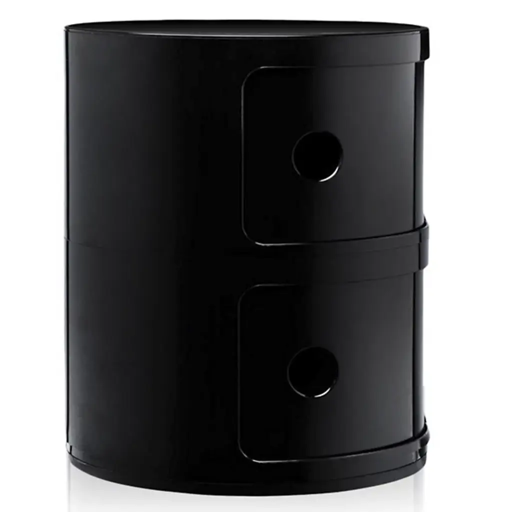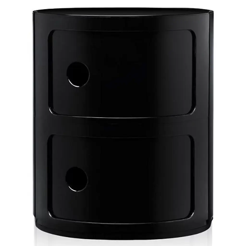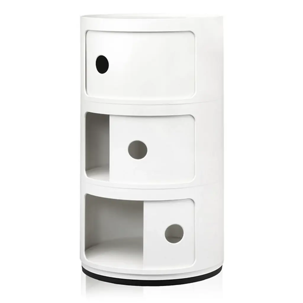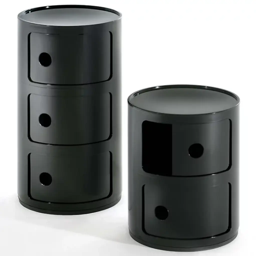 The Componibili Round Modular Stacking Units Units, designed by Anna Castelli Ferrieri, features a modular unit with a tray top that has been produced for more than thirty years and is exhibited at the Museum of Modern Art in New York. The Componibili Modules are suitable for every kind of domestic use, such as a bedside table or storage in the bathroom, kitchen, or children's rooms.