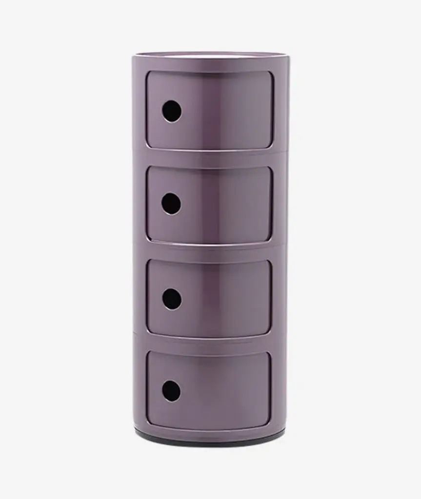 The Componibili Round Modular Stacking Units Units, designed by Anna Castelli Ferrieri, features a modular unit with a tray top that has been produced for more than thirty years and is exhibited at the Museum of Modern Art in New York. The Componibili Modules are suitable for every kind of domestic use, such as a bedside table or storage in the bathroom, kitchen, or children's rooms.