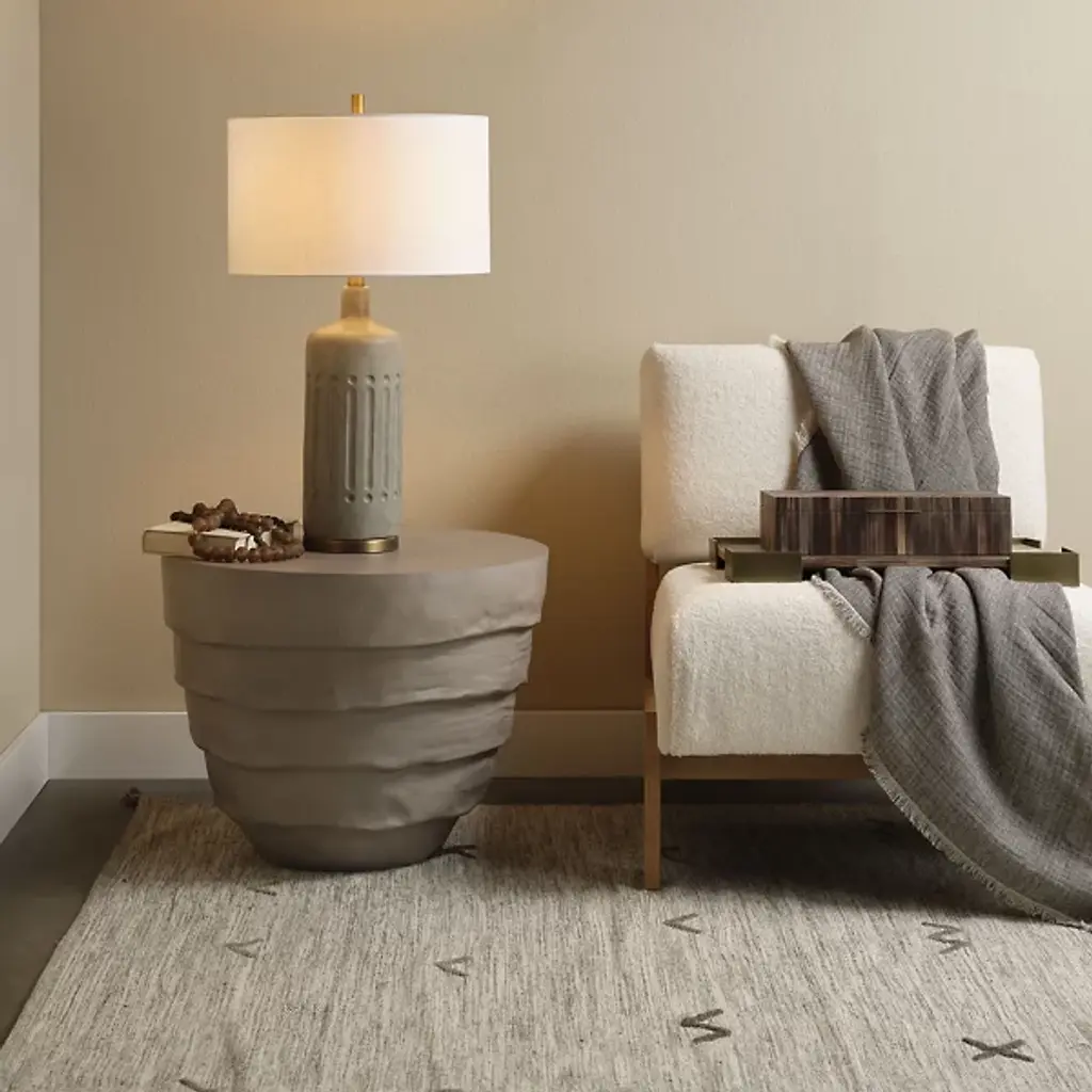 The Concentric Side Table from Jamie Young Co. brings a rugged, unrefined presence to modern living spaces. Its unique, concentric form is sculpted from fiberglass with fluid lines and changing textures that mimic patterns found in nature. The hand-finishing process also ensures no two tables are exactly alike, with subtle variations in texture and form. The protective end caps allow for stable placement on any surface. This table works well alone or grouped with others to create dynamic arrangements.