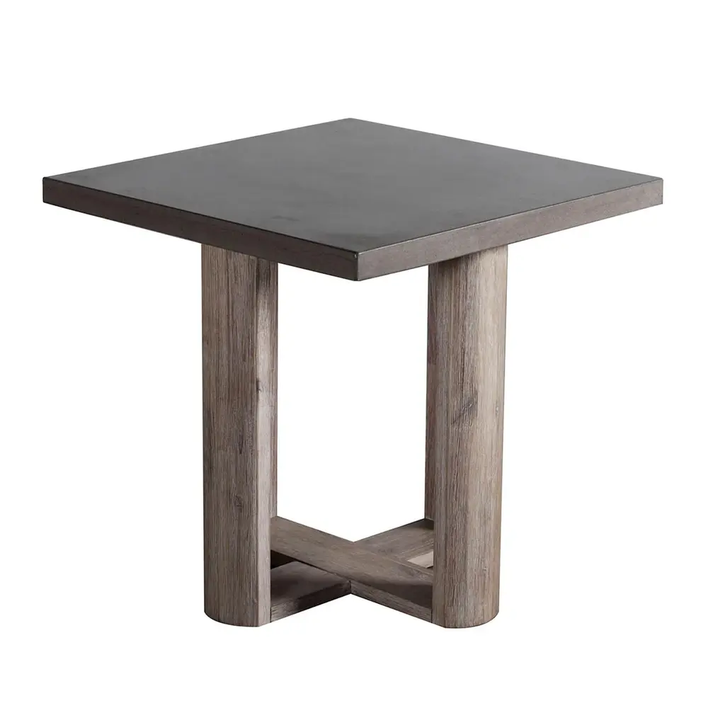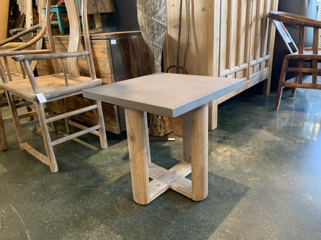 Modern square lightweight concrete top side table with grey washed X design acacia wood base. Wonderful used outdoors or indoors. Each will vary in natural material differences including tones, grain, and inherent imperfections. Weight of table is approx 35 lbs.